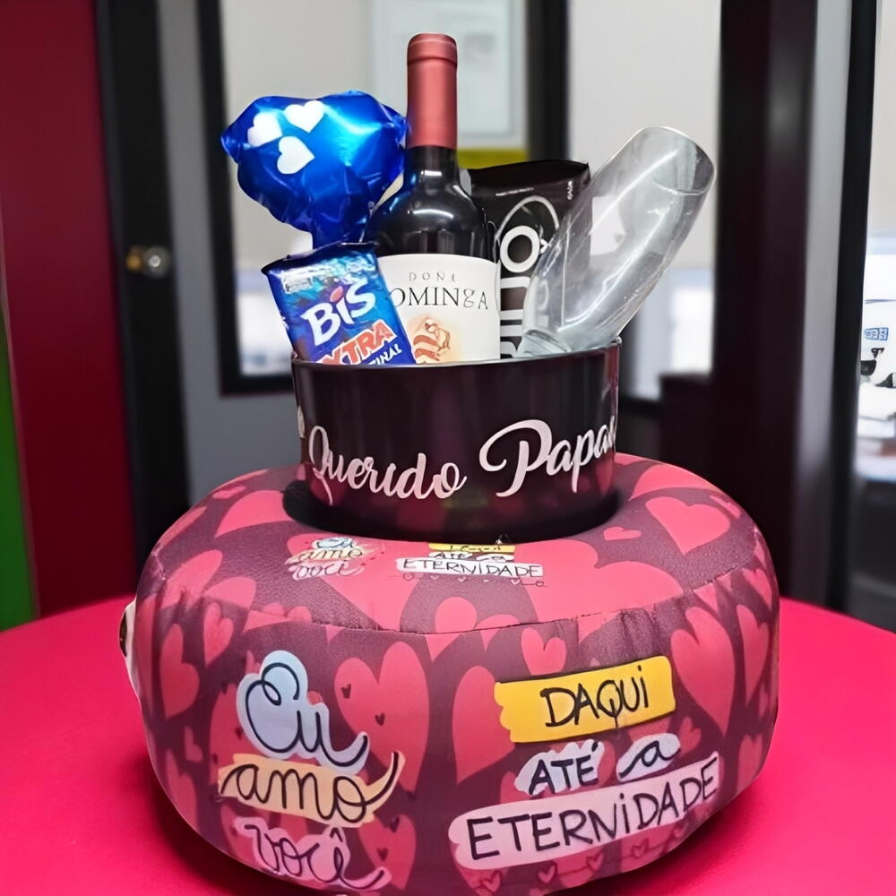 vinho - 1 un. taça - 1 un. barras de chocolate - 2 un. mini balão personalizado - 1 un. balde personalizado - 1 un. almofada personalizada - 1 un.
