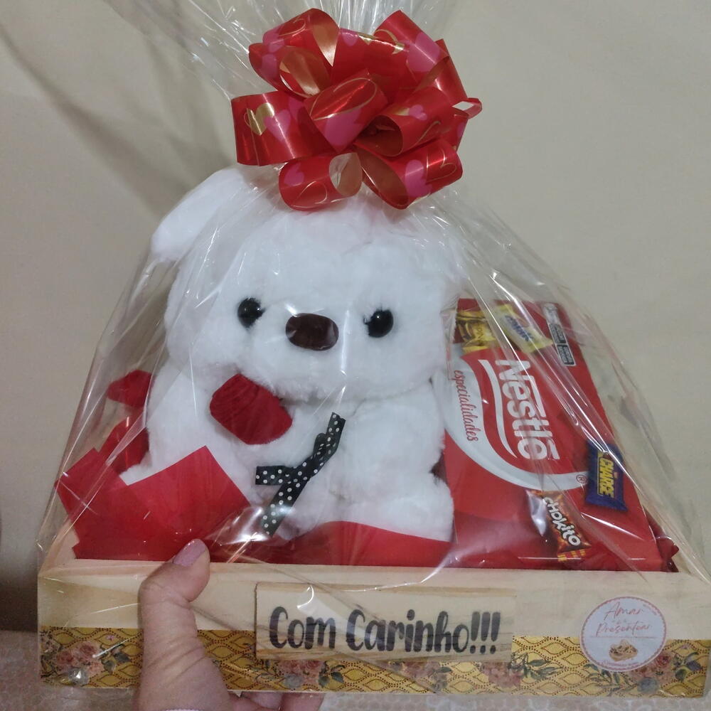 embalagem - 1 un. urso de pelúcia - 1 un. caixa de bombom - 1 un. cesta de madeira - 1 un.