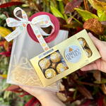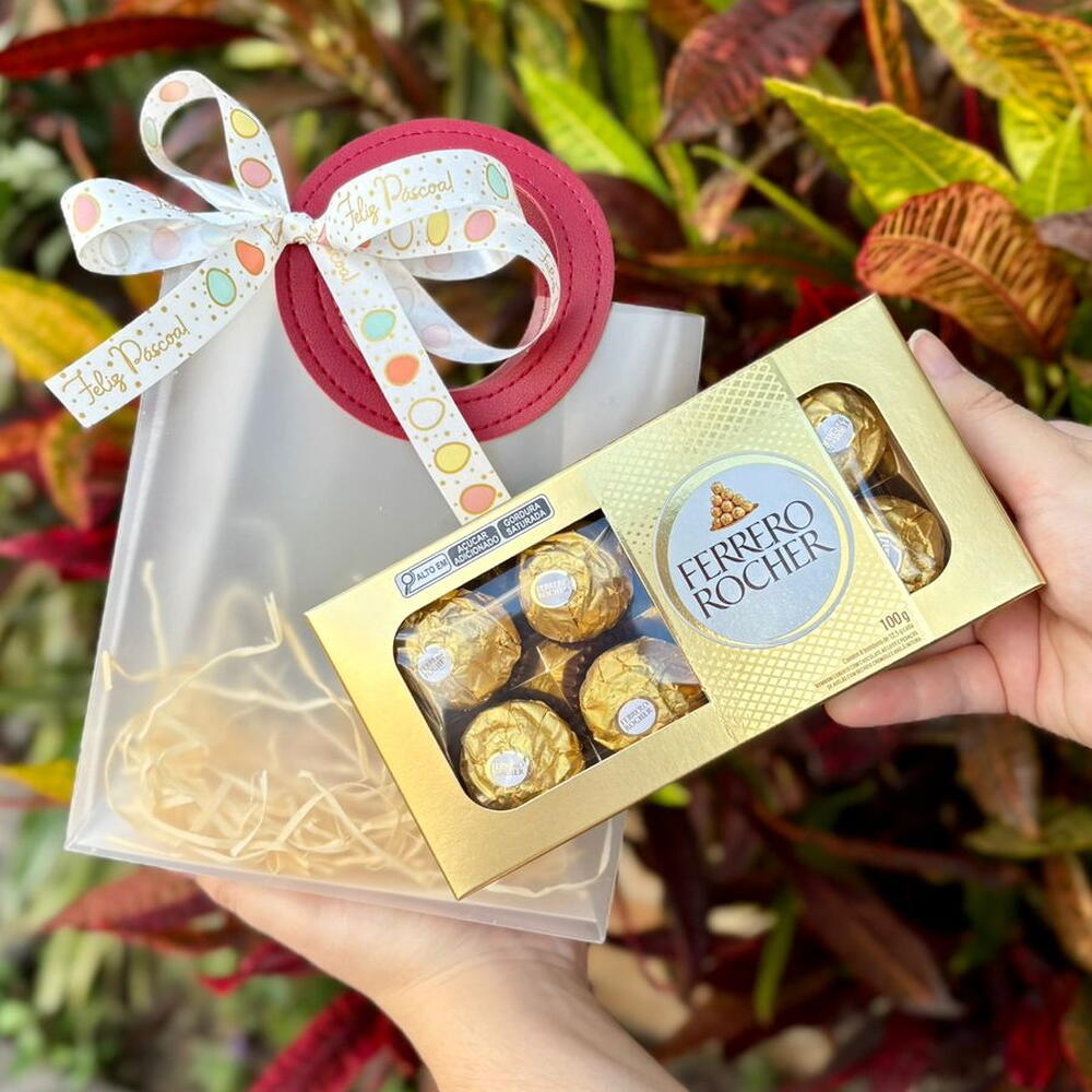 laço - 1 un. saco celofane transparente - 1 un. 1 sacolinha transparente fosca com alça de couro - 1 un. caixa de chocolates ferrero rocher 8 unidades - 1 un.