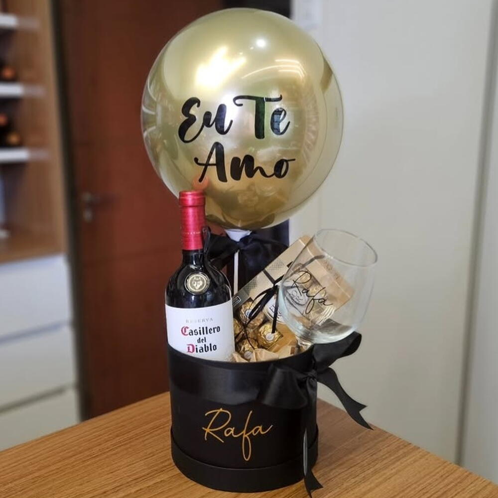 flores - 3 un. vinho - 1 un. taça - 1 un. chocolate - 1 un. pelucia - 1 un. laço em cetim - 1 un. box (caixa) - 1 un.