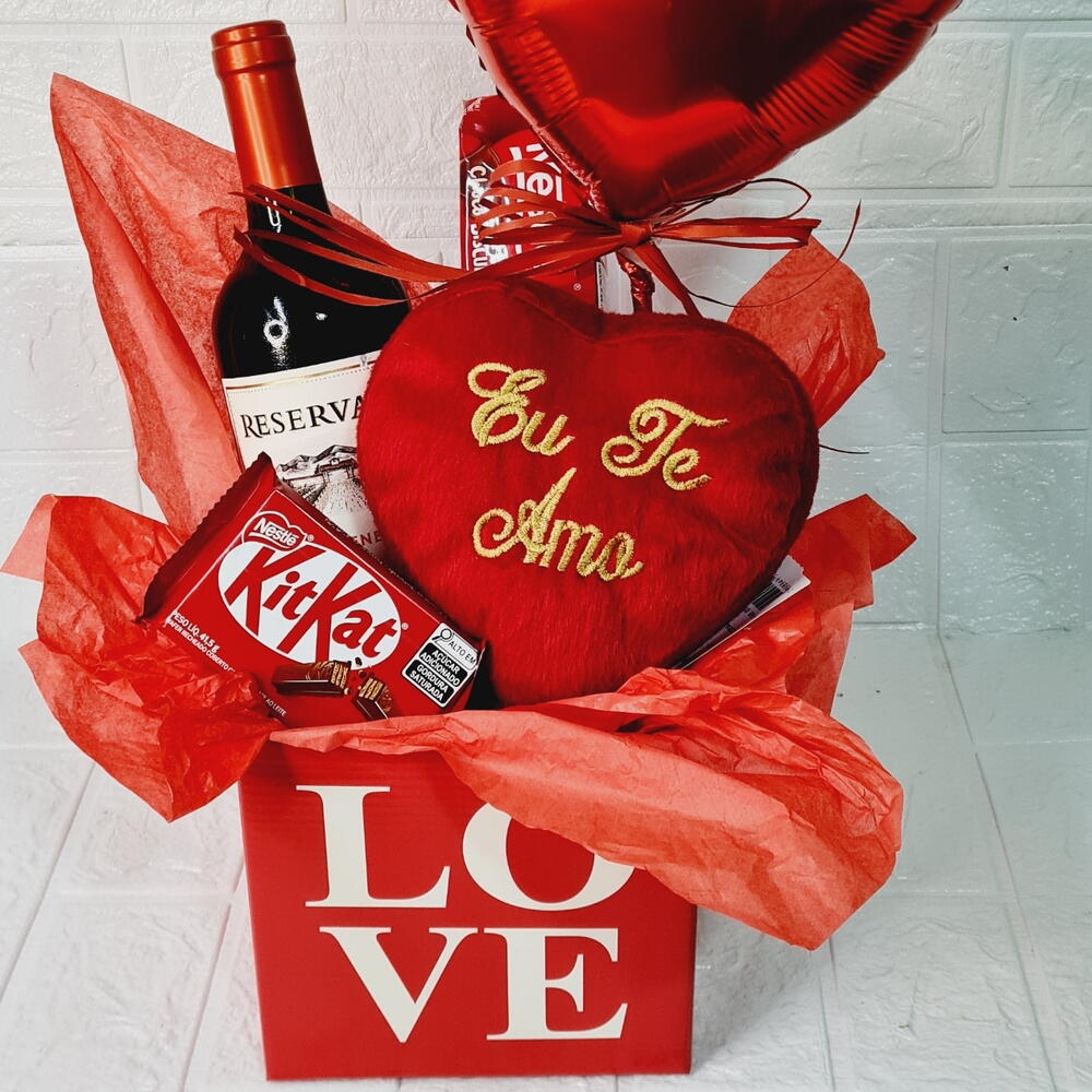 kit kat 41 g - 1 un. coração pelúcia p - 1 un. vinho tinto 750 ml - 1 un. balão 10 p - 1 un. biscoito doce 78 g - 1 un. caixa de papelão love - 1 un.