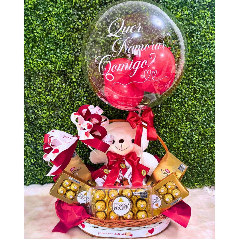 embalagem - 1 un. balão personalizado - 1 un. cesta vime - 1 un. barras nestlé - 3 un. caixa alpino - 2 un. laço artesanal - 1 un. ferreiro rocher 12 un - 1 un. ferreiro rocher 8 un - 2 un. urso pelúcia grande - 1 un. carta cortesia - 1 un.