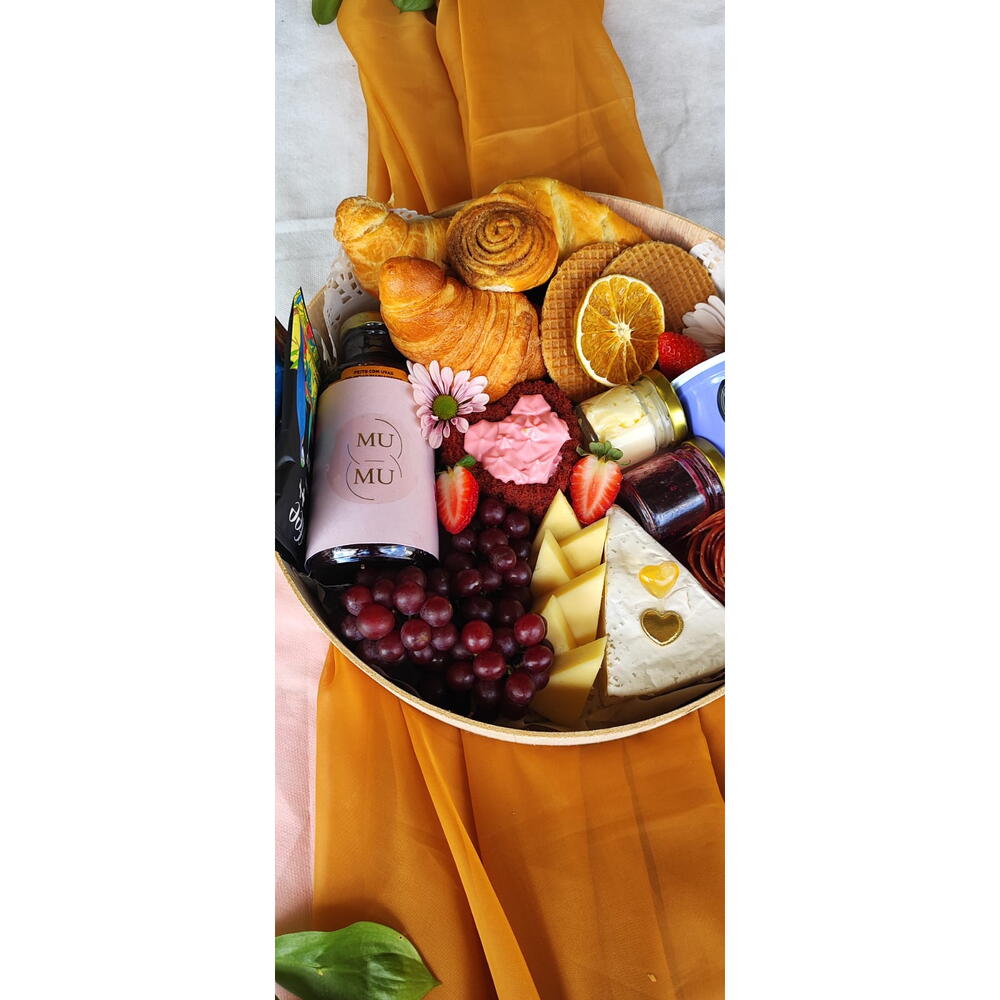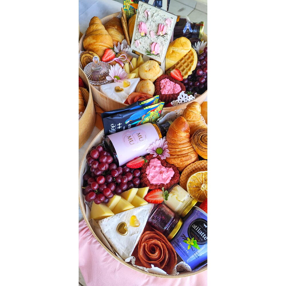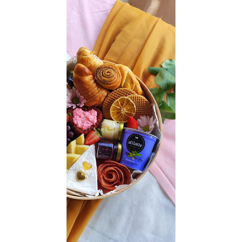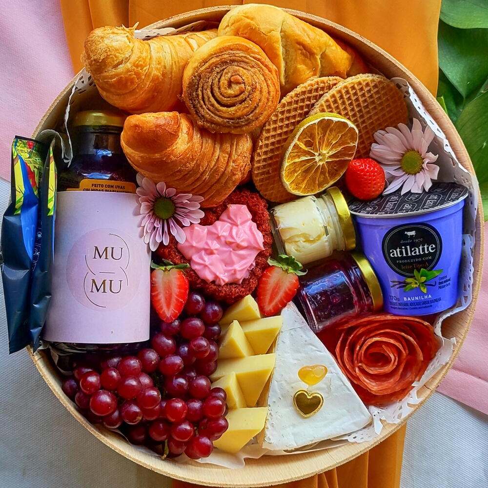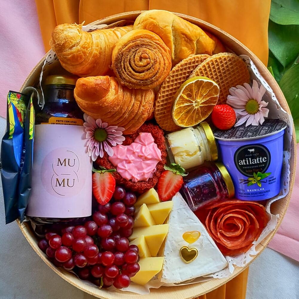 queijo brie - 1 un. queijo minas - 2 un. charcutaria - 1 un. geleia e manteiga - 1 un. bolo em formato de coração - 1 un. frutas frestas - 1 un. suco e dripcoffee - 2 un. pães artesanais e croissant - 2 un.