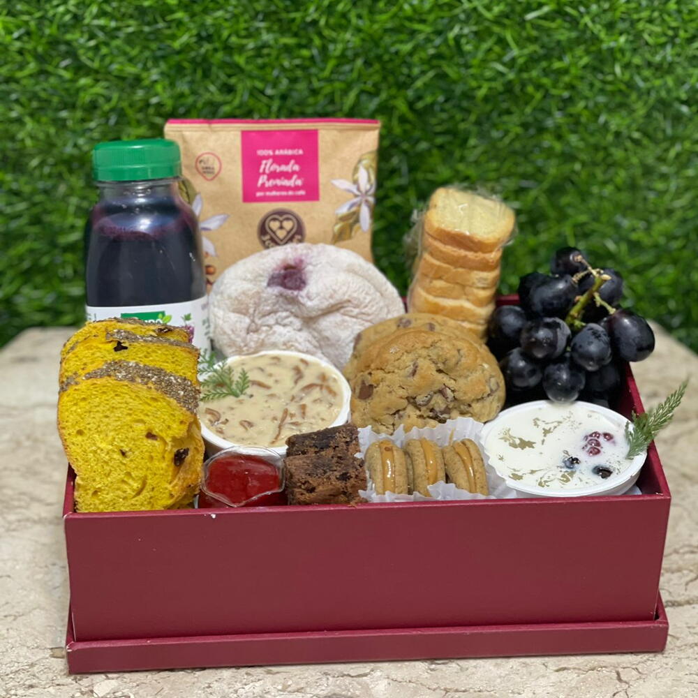 suco de uva - 1 un. cesta - 1 un. cookie - 1 un. iogurte grego - 1 un. brownie - 1 un. donut - 1 un. uvas frescas - 1 un. café drip - 1 un. pão rústico artesanal - 1 un. antepastos de queijos e frutas secas - 2 un. dip de catupiry com cebola caramelizada - 1 un. geleia artesanal de morango - 1 un. torradinhas canapé - 1 un. bolachinhas amanteigadas de café recheadas com doce de leite - 1 un.