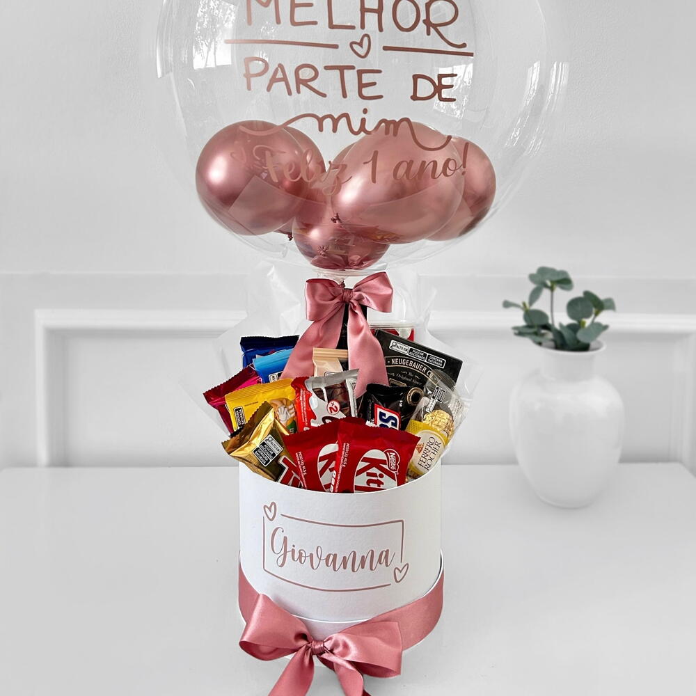 chocolates - 13 un. embalagem celofane - 1 un. box personalizada (verificar disponibilidade) - 1 un. balão bubble 24 polegadas com laço de cetim - 1 un.