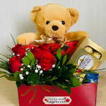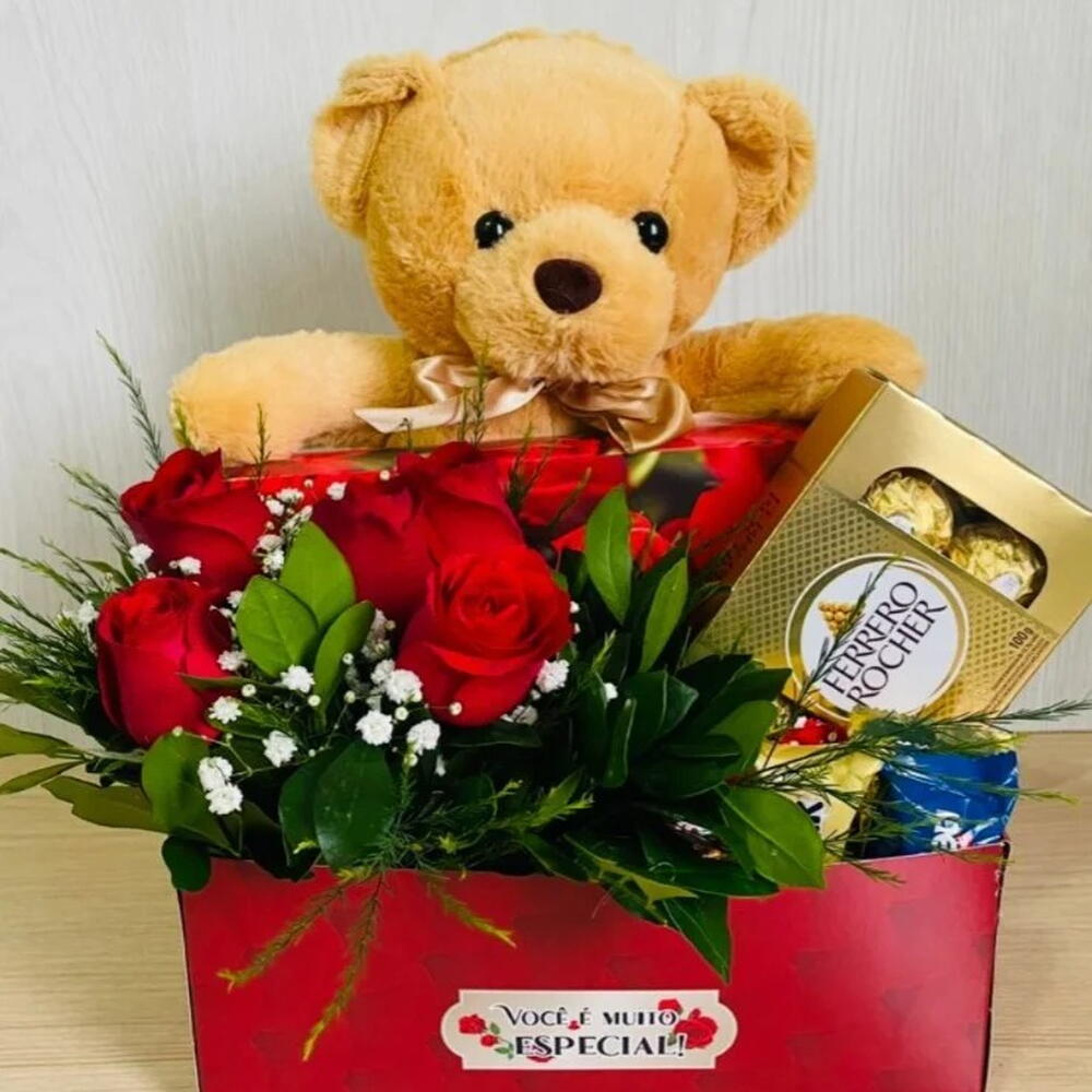 Um gesto simples pode abrir as portas para um grande amor... 🌹 Contém: Pelúcia M | 1 Unidade; Caixa de Bombons Italiano Ferrero Rocher (c/ 8 Unidades) | 1 Unidade; Arranjo com 5 Rosas | 1 Unidade; Bombons Chocolate ao Leite (Nestlé) | 1 Caixa; Cartão de Felicitações | 1 Unidade; Caixa Decorada | 1 Unidade.