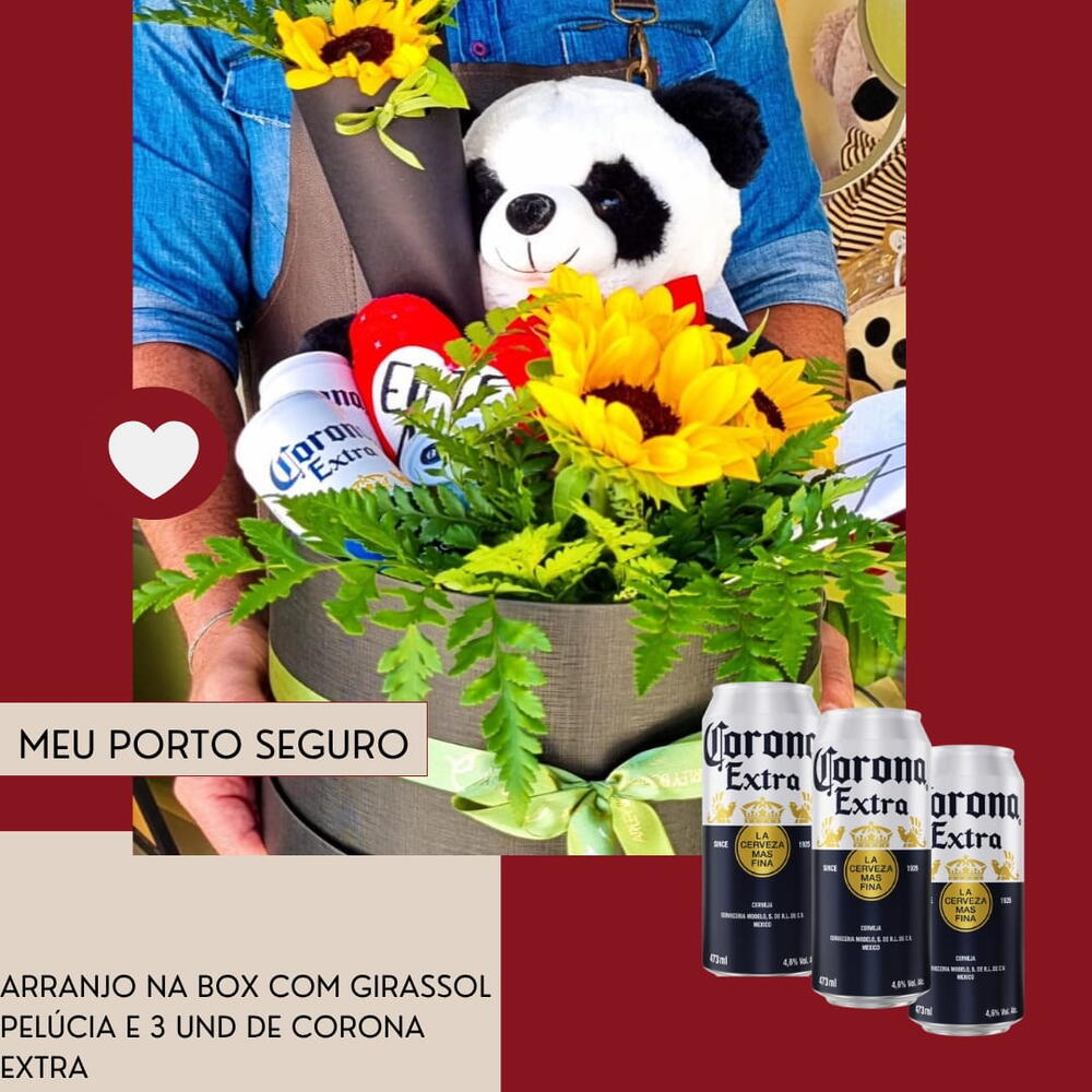 Este presente magnífico é a união perfeita de beleza e sofisticação. Composto por um arranjo deslumbrante de girassóis, que transmitem alegria e positividade, e uma folhagem elegante para adicionar um toque de frescura. Para saborear, temos três latas autênticas de Corona, perfeitamente resfriadas e prontas para brindar os bons momentos. Acompanha um girassol apresentado numa charmosa cone, além de uma adorável pelúcia para adoçar o presente. Tudo isso cuidadosamente embalado numa caixa decorada e finalizada com um delicado laço. Este é o presente perfeito para surpreender alguém especial.
