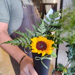 folhagens - 1 un. pelucia - 1 un. arranjo de girassois - 1 un. box decorada com laço - 1 un. corona em lata - 3 un. girassol no cone - 1 un.