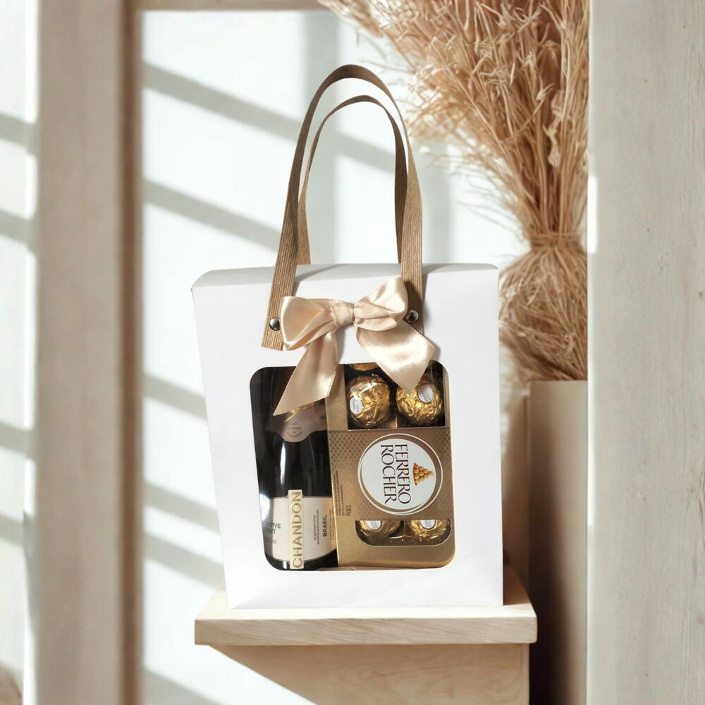 caixa de chocolate ferrero rocher 100g - 1 un. espumante chandon 187ml; - 1 un. sacola decorativa com visor. - 1 un.
