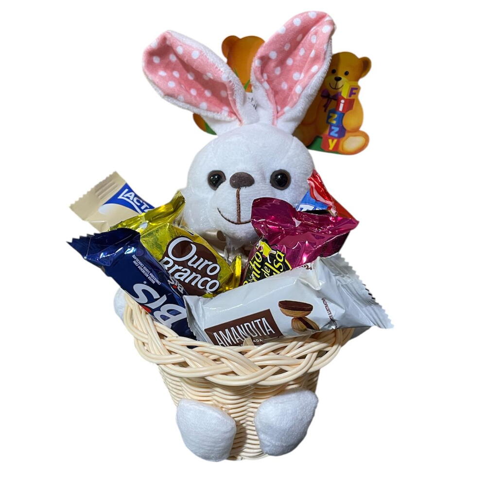 Um delicado coelhinho de pelúcia medindo 15x20cm, onde em sua cestinha constém bombons de chocolate para alegrar quem os recebe.