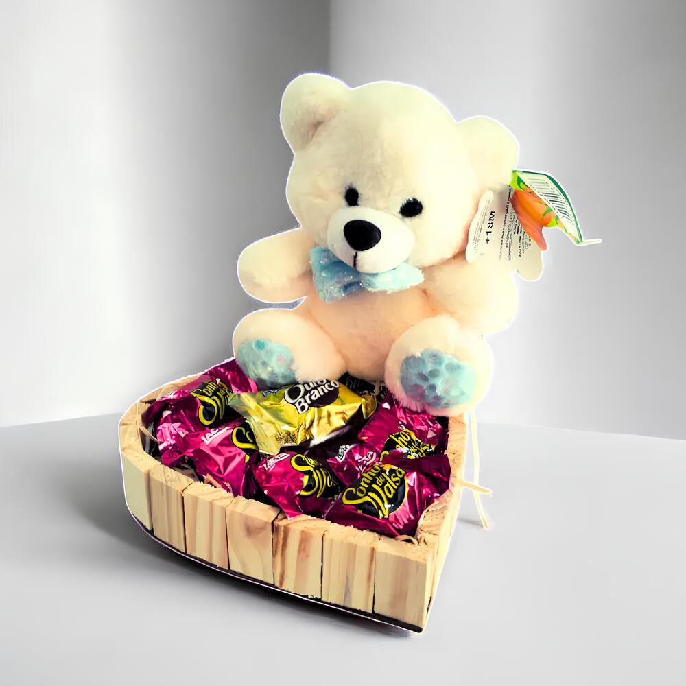 Este é um tesouro de deleite açucarado em uma cesta pequena em formato de coração! Apresentado com amor, possui 6 unidades de Chocolates Sonho de Valsa e Ouro Branco, cada um com 32g, para adoçar seu dia ou de quem você ama. Para tornar este presente ainda mais especial, também incluímos um adorável urso de pelúcia de 15cm. Este é um presente que certamente trará um sorriso!
