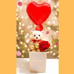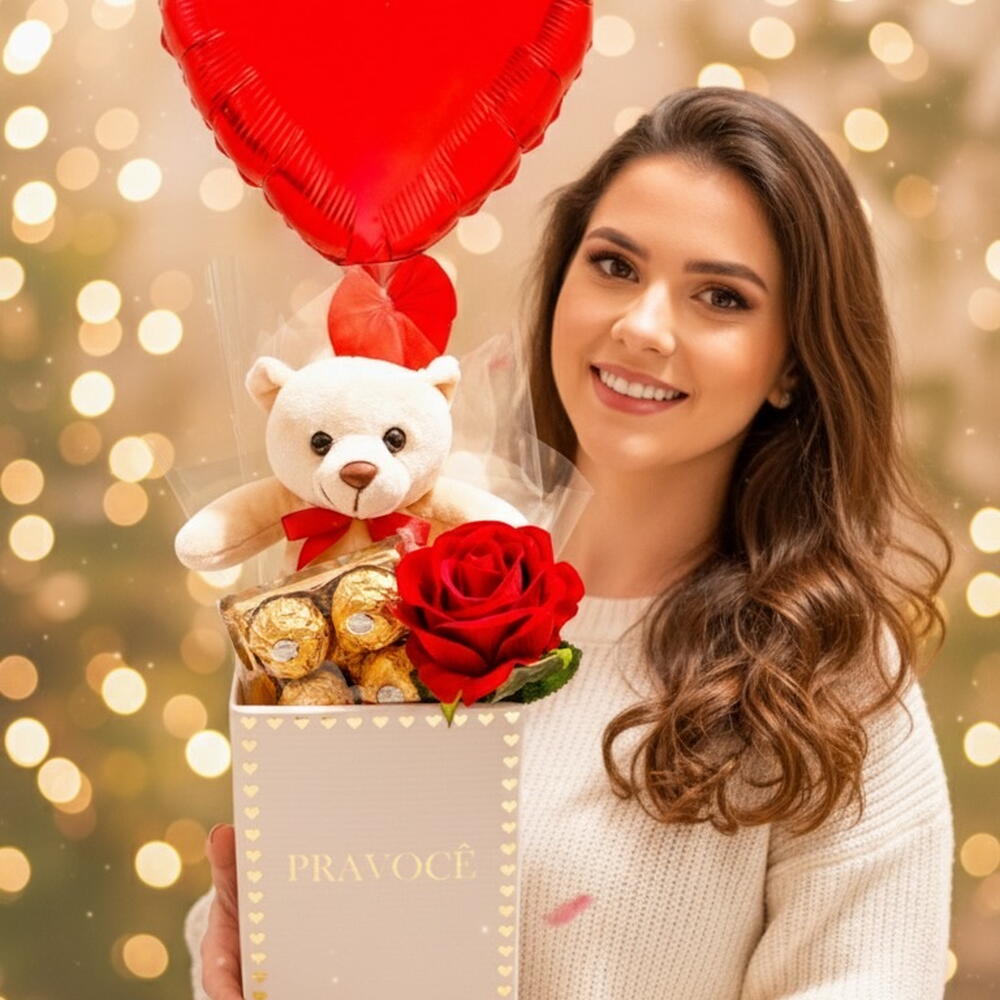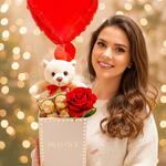 Esta bela cesta de presentes de chocolate é composta por uma unidade de ursinho de pelúcia, uma unidade de Ferrero Rocher, uma rosa realística e vem acomodada numa caixa elegante. Um presente perfeito cheio de surpresas doces e encantadoras, ideal para expressar sentimento em qualquer ocasião especial.