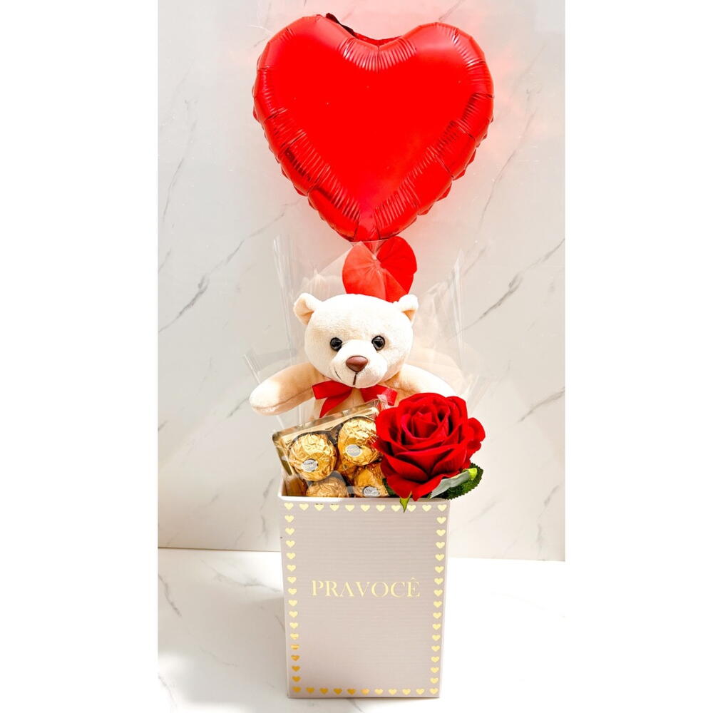 urso - 1 un. ferrero rocher - 1 un. box (caixa) - 1 un. uma rosa realística - 1 un.