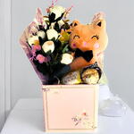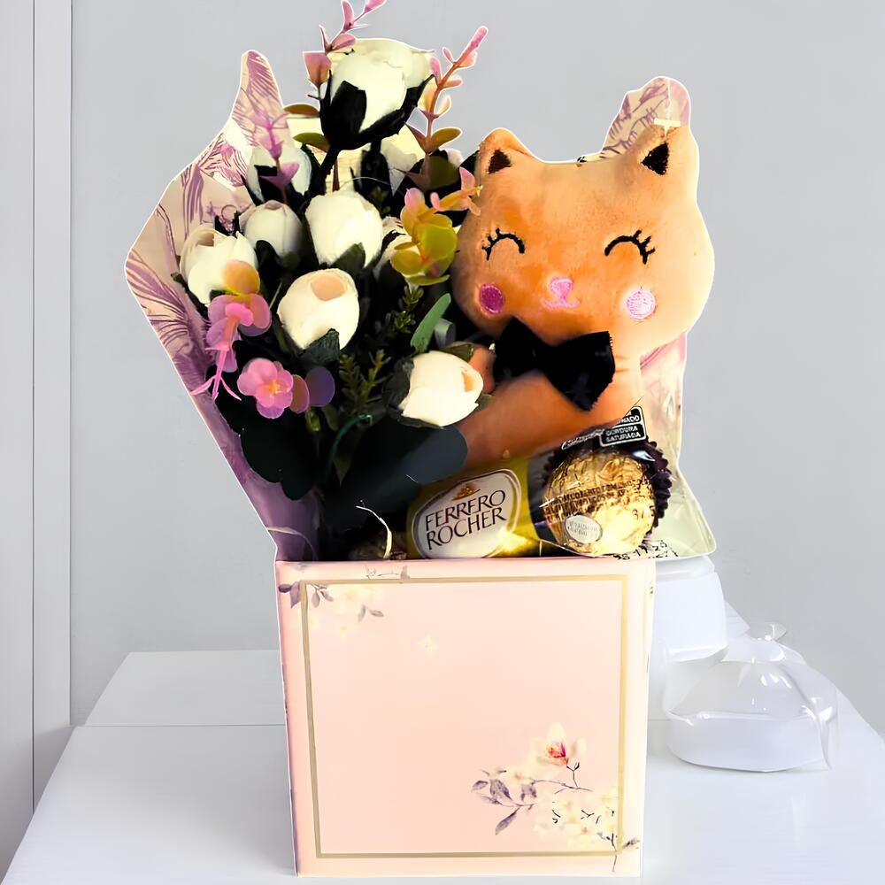 Esta maravilhosa cesta de chocolate é o presente perfeito para quem gosta de saborear e se encantar. Ela contém uma encantadora pelúcia de gatinho chaveiro em tamanho pequeno, perfeita para adicionar um toque especial à bolsa ou mochila de quem a receber. Além disso, a cesta inclui três bombons Ferrero Rocher, famosos pela sua crocância e sabor inconfundível. Para completar o charme do presente, um buquê de rosas artificiais e um delicado cachepot de cartonagem acompanham os demais itens. Este conjunto é uma bela surpresa e uma maneira doce de demonstrar seus sentimentos.