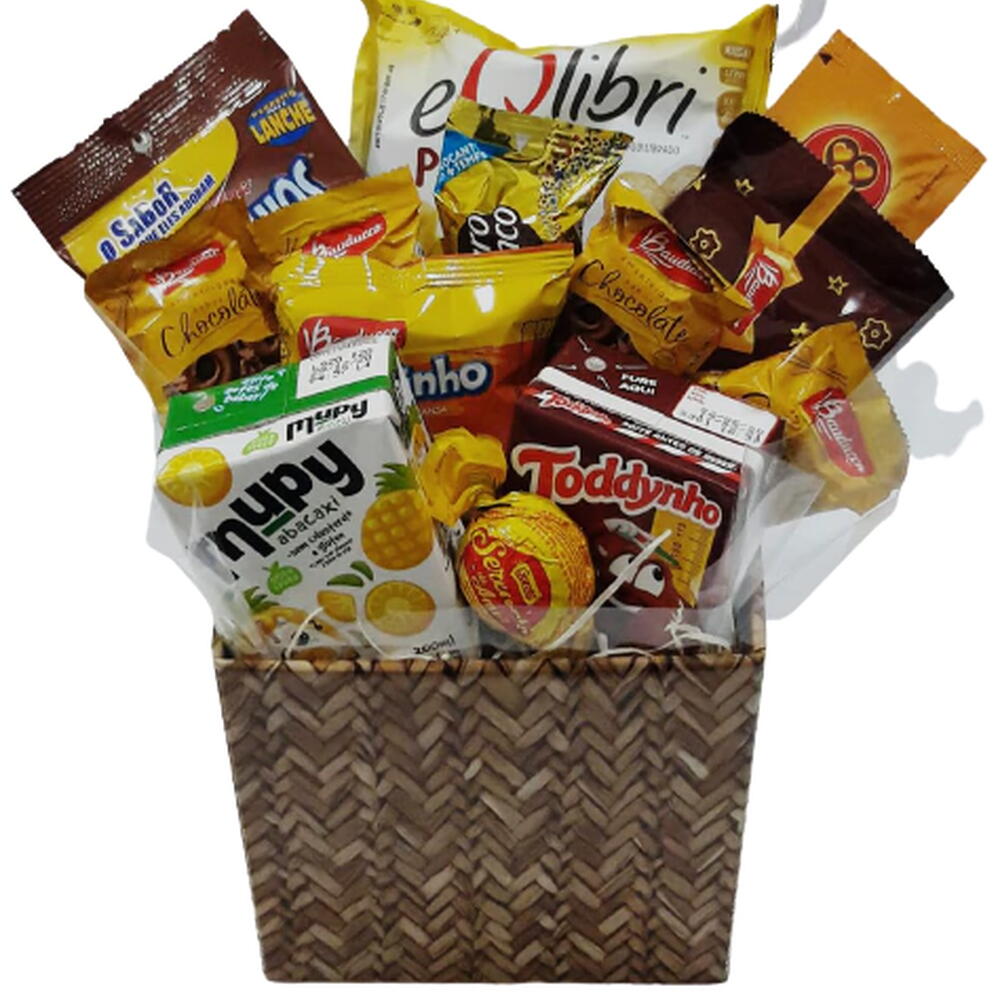 pão de mel - 1 un. bolinho - 1 un. capuccino - 1 un. achocolatado - 1 un. bombons - 2 un. caixa decorada - 1 un. cereal - 1 un. bolachas doce - 3 un. pacote de torradas - 1 un. mupy - 1 un.