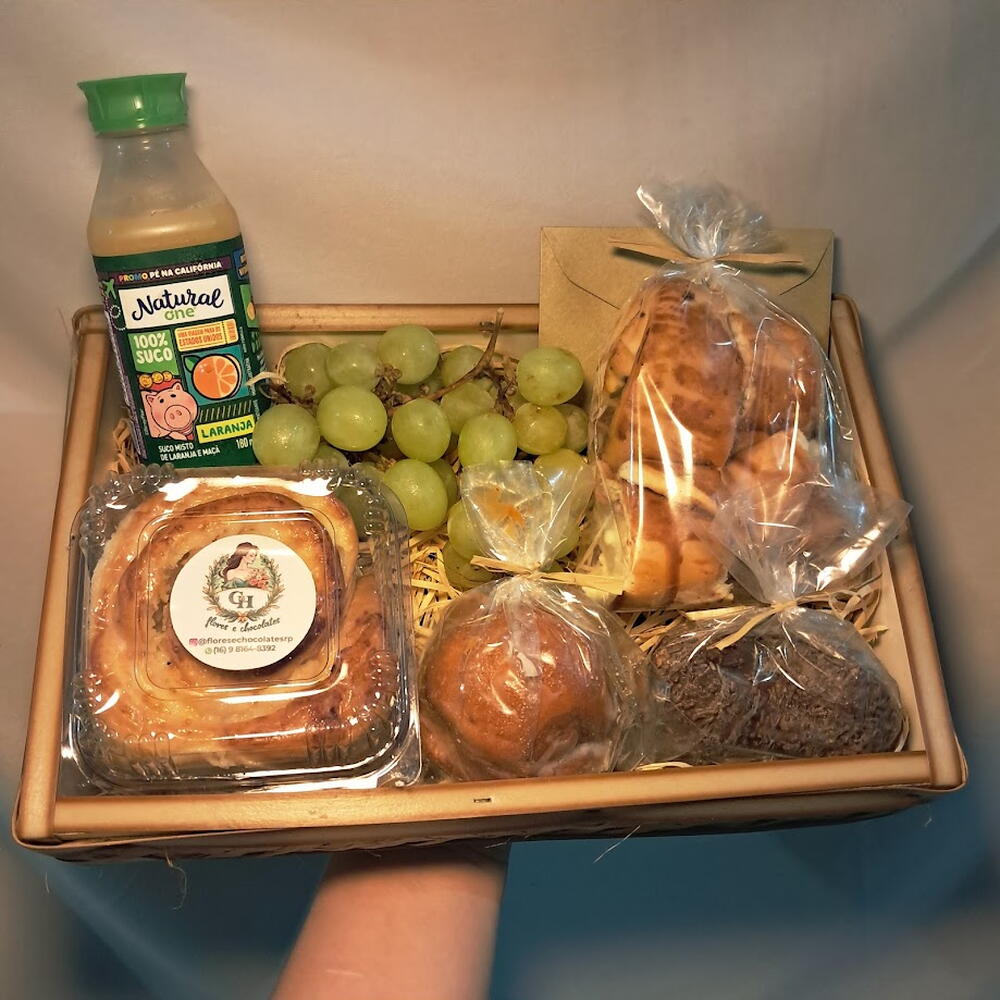 mini sonho - 1 un. suco natural 200ml - 1 un. fruta fresca - 1 un. salgados sortidos - 4 un. bandeja decorativa - 1 un.
