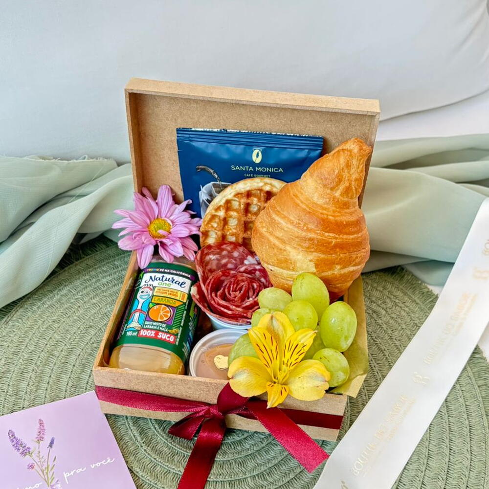 laço - 1 un. uvas sem caroço - 1 un. embalagem celofane - 1 un. flor de salame italiano - 1 un. waffle americana - 1 un. flor para decorar - 1 un. drip coffee gourmet - 1 un. potinho de doce de leite artesanal - 1 un. croissant folhado o original francês - 1 un. suco de laranja natural one 180ml - 1 un. caixa box de madeira quadrada tam 15x15cm e 5cm de altura - 1 un.