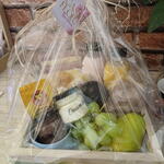 fruta - 2 un. frios - 2 un. chá - 1 un. café - 1 un. pães - 2 un. danone - 1 un. embalagem personalizada com laço - 1 un. cesta madeira pinus - 1 un.
