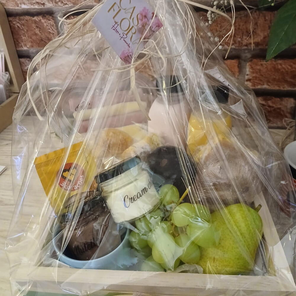 fruta - 2 un. frios - 2 un. chá - 1 un. café - 1 un. pães - 2 un. danone - 1 un. embalagem personalizada com laço - 1 un. cesta madeira pinus - 1 un.