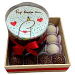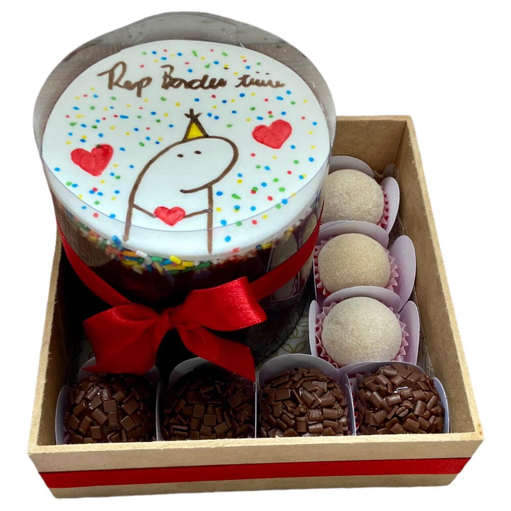 velinha - 1 un. cartão dedicatória - 1 un. brigadeiros gourmet tradicional - 4 un. uma caixa em madeira mdf 15x15 - 1 un. mini bolo com frase (500gr em média) - 1 un. brigadeiros gourmet leite ninho - 3 un.