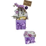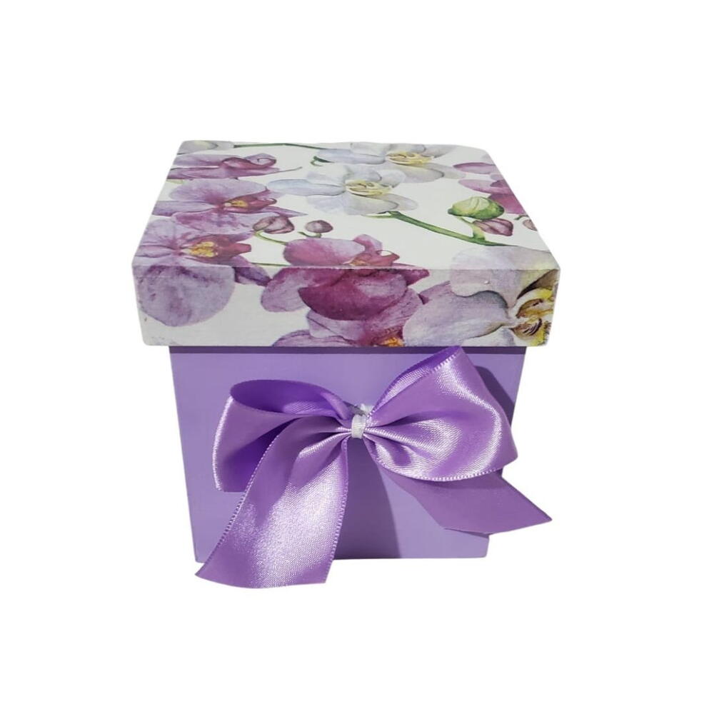 caixa de mdf - 1 un. trio de ferrero rocher - 1 un. mini orquídea - 1 un. plaquinha " para uma super mulher " - 1 un. pintada a mão - 1 un. com tampa estampa floral feito em decoupage e um laço de cetim lilás - 1 un.