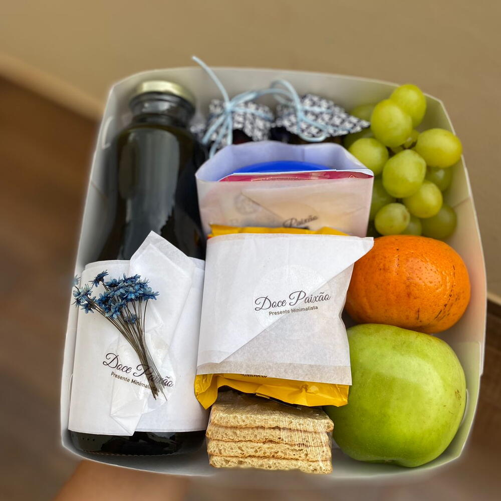 frutas - 3 un. suco de uva - 1 un. bolinho - 1 un. torrada - 1 un. geleia - 1 un. caixa decorada - 1 un. granola - 1 un. danone grego - 1 un. laço e cartão - 1 un. cesta de café da manhã individual - 1 un.