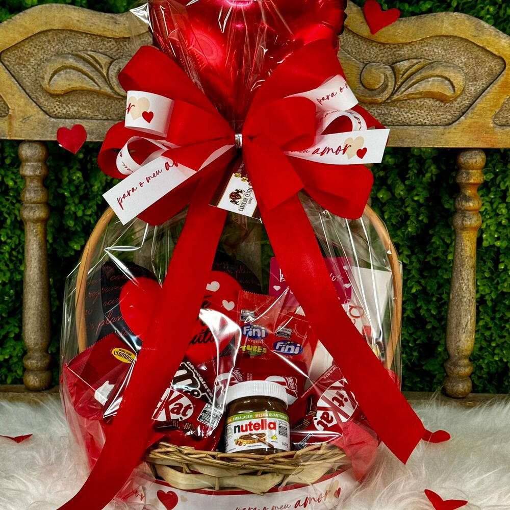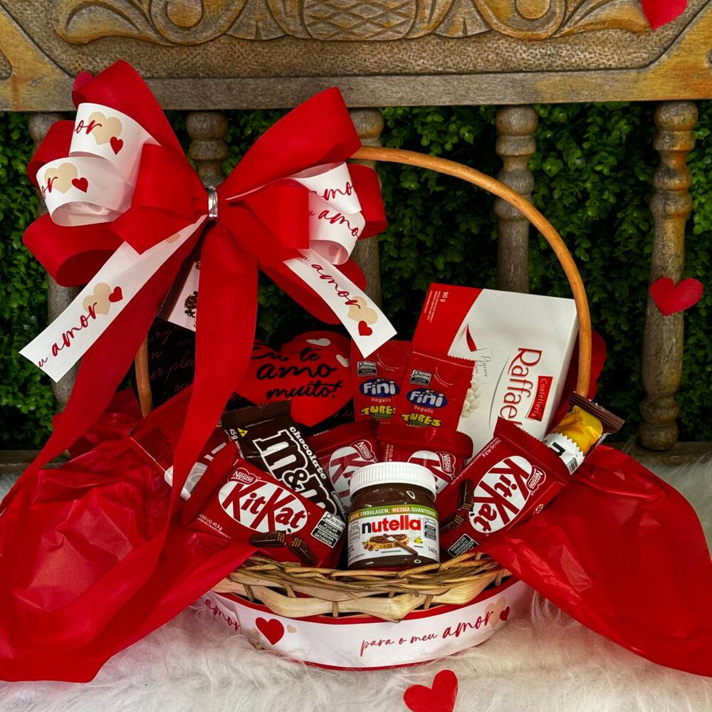 Dê um presente de indulgência com esta cesta de luxo recheada de chocolates deliciosos. Esta cesta contém 4 unidades de KitKat, chocolate cravejado com deliciosas barritas crocantes. Além disso, também contém 1 unidade de Nutella B Ready e MMS, perfeitos para os amantes de avelã e amendoim. Dois saquinhos de Fini de 15 gr, além de um delicioso pacote de Rafaello de 90 gr, são incluídos para um toque final de prazer. Há também uma deliciosa Barra Nestlé de 80 gr, oferecendo a autêntica experiência do chocolate. Tudo é cuidadosamente arranjado em uma cesta decorada com um laço, garantindo uma apresentação elegante e sofisticada. Uma embalagem durável para proteger os produtos e um laço adicional são adicionados para o toque final. Este é o presente perfeito para qualquer ocasião especial, seja um aniversário, Dia dos Namorados ou apenas para mostrar que você se importa.