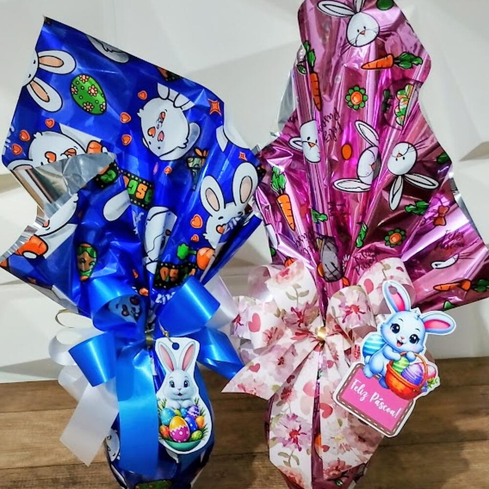 Dois ovos de Páscoa com 250 gs cada lindamente embalados, perfeitos para presentear com charme e muito carinho. Uma combinação encantadora de doçura, delicadeza e o espírito especial da Páscoa em cada detalhe. Ideal para surpreender quem você ama com um presente doce, criativo e inesquecível.