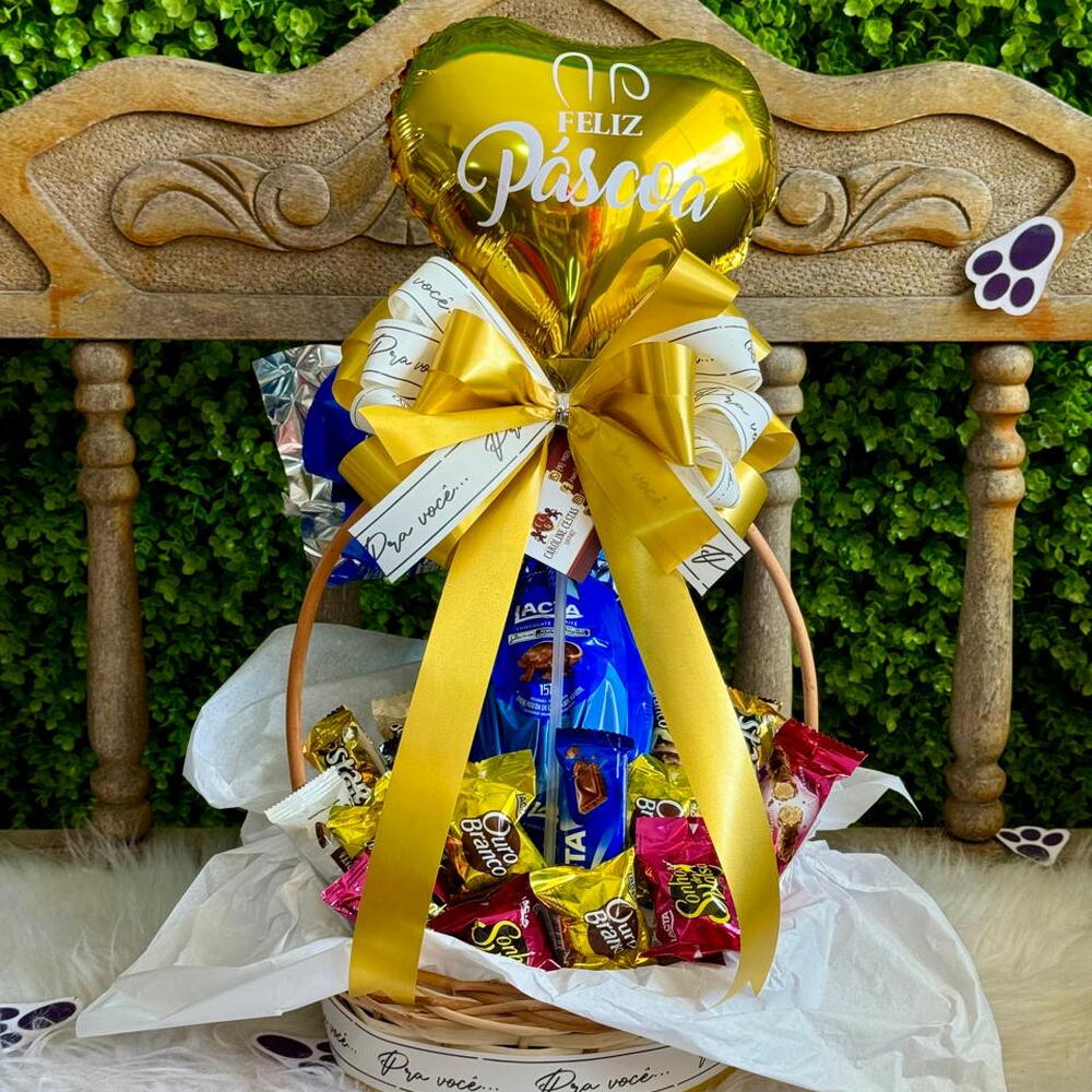 bombons sortidos lacta - 16 un. cesta de vime com embalagem decorativa e laço artesanal - 1 un. ovo lacta ao leite 166gr - 1 un. balão dourado feliz páscoa - 1 un.