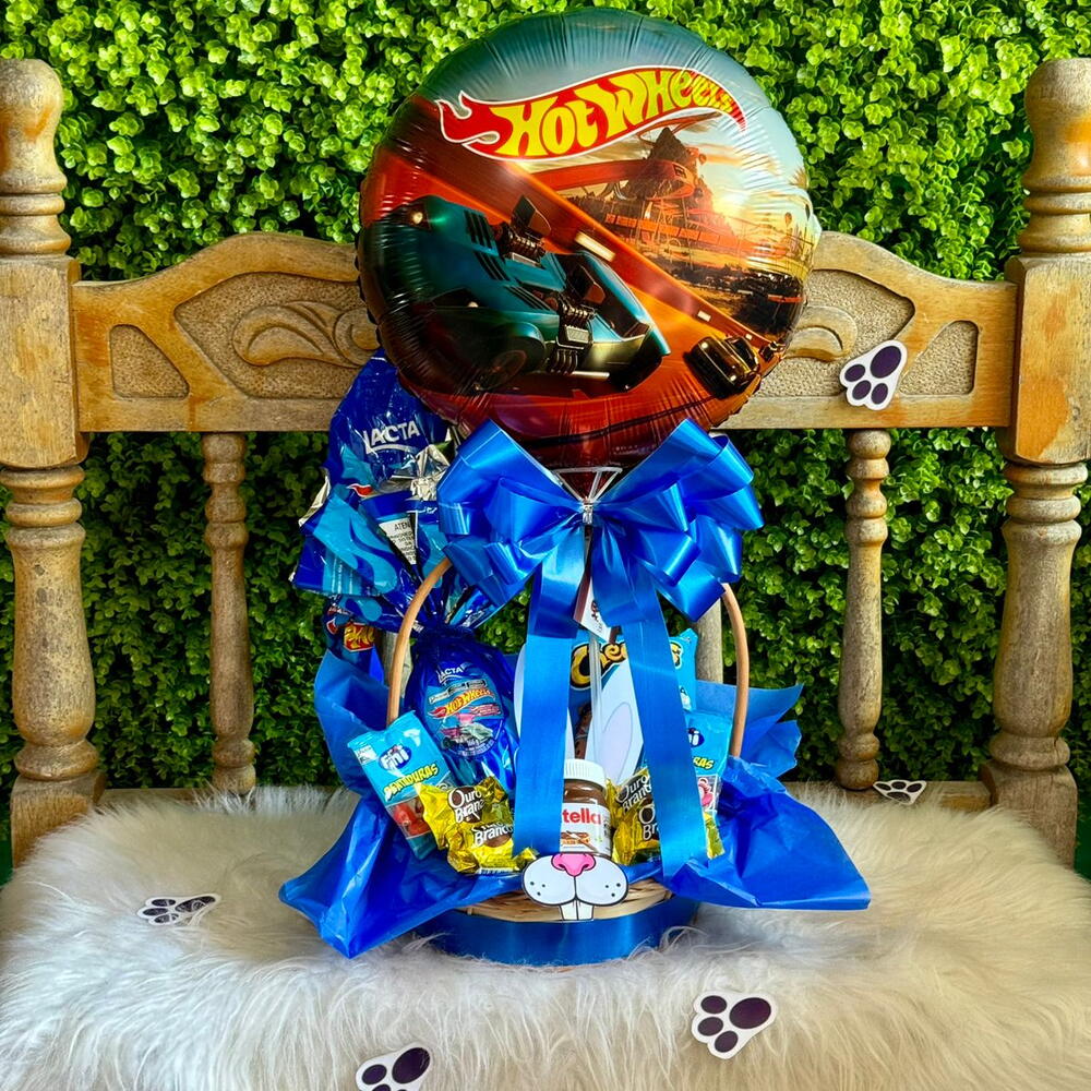 nutella 140g - 1 un. fini 15g - 2 un. cheetos 39gr - 1 un. cesta de vime com embalagem decorativa e laço artesanal. - 1 un. ovo lacta hot wheels 166gr - 1 un. outo branco bombom - 4 un. balão 45cm hot wheels - 1 un.