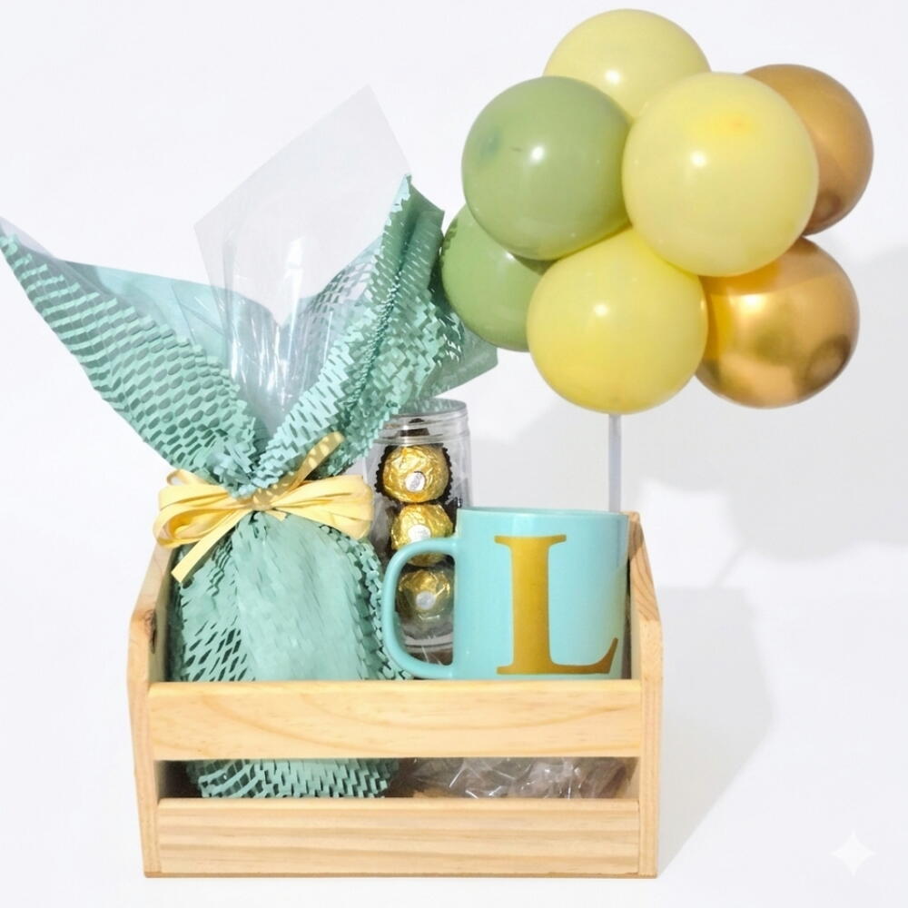 kit de mini balões - 1 un. 1 ovo de acetato com uma caixa de bombom dentro - 1 un. 1 caneca de cerâmica com letra do nome - 1 un. 1 trio de ferrero rocher no cilindro - 1 un.
