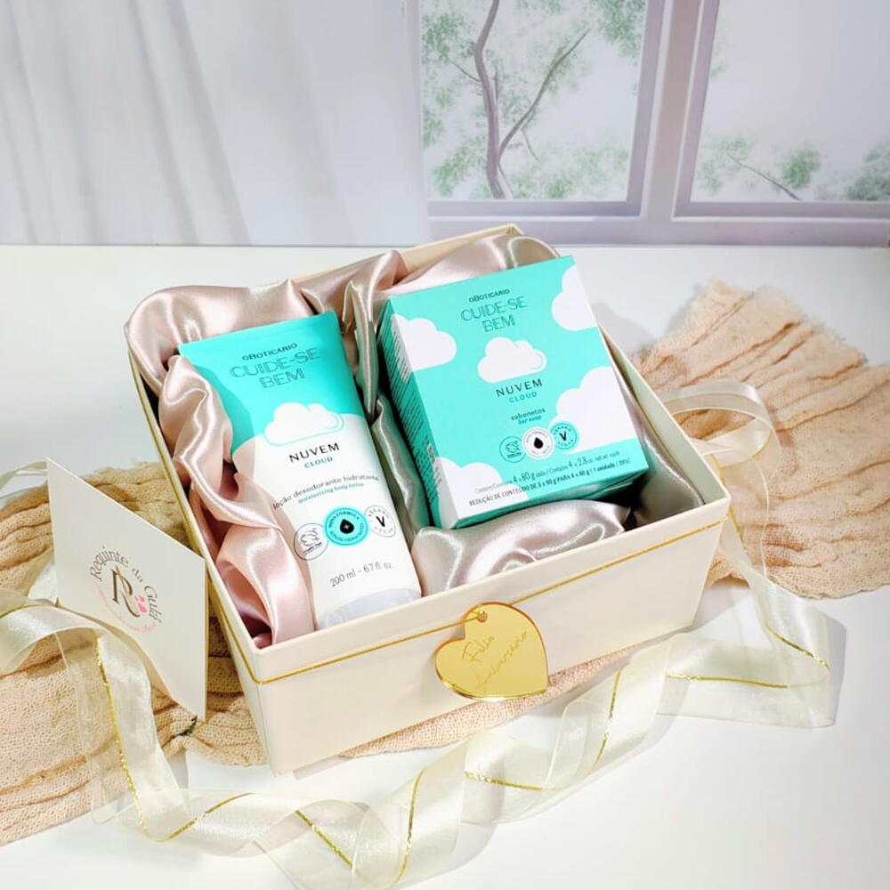 fita de cetim - 1 un. caixa com sabonetes - 1 un. caixa cartonada premium com forração em tecido de cetim - 1 un. tag em acrílico no formato de coração - 1 un. cartão de mensagem fino - 1 un. creme hidratante natura linha cuide-se bem - 1 un. tecido tule para fechamento do presente - 1 un.