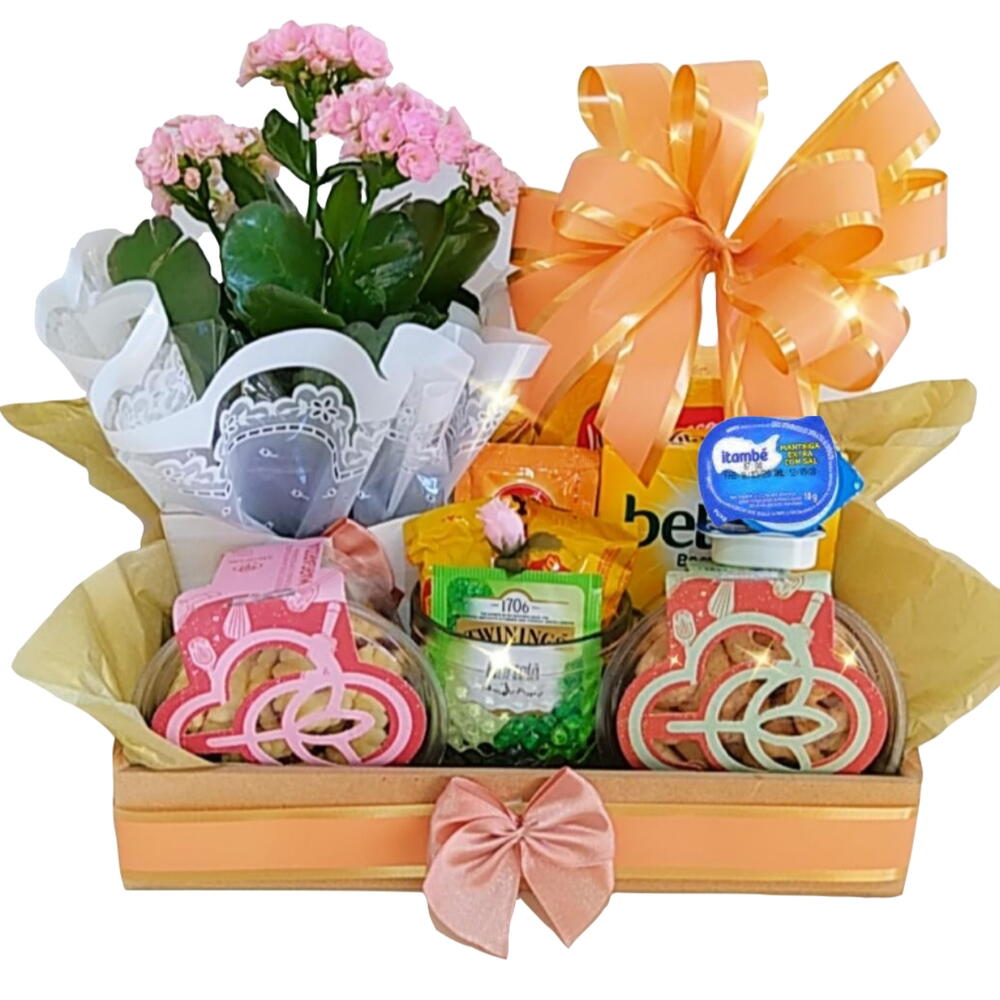sachê de chá - 1 un. sachê de cappuccino - 1 un. embalagem e laço - 1 un. 100g de rosquinha de queijo - 1 un. bandeja em mdf pequena - 1 un. vaso plantado de kalanchoe ou calandiva em cachepot - 1 un. xícara de chá em vidro transparente - 1 un. blisters de manteiga - 2 un. caixa de bolacha belvita - 1 un. pacote de torradas bauducco 142g - 1 un. 130g de casadinho de goiabada - 1 un.