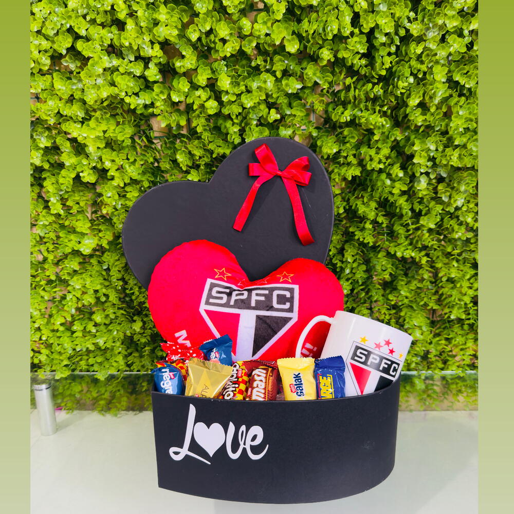 chocolate - 10 un. caixa coração - 1 un. laço em cetim - 1 un. almofada temática do são paulo fc - 1 un. xícara de acrílico do são paulo fc - 1 un.