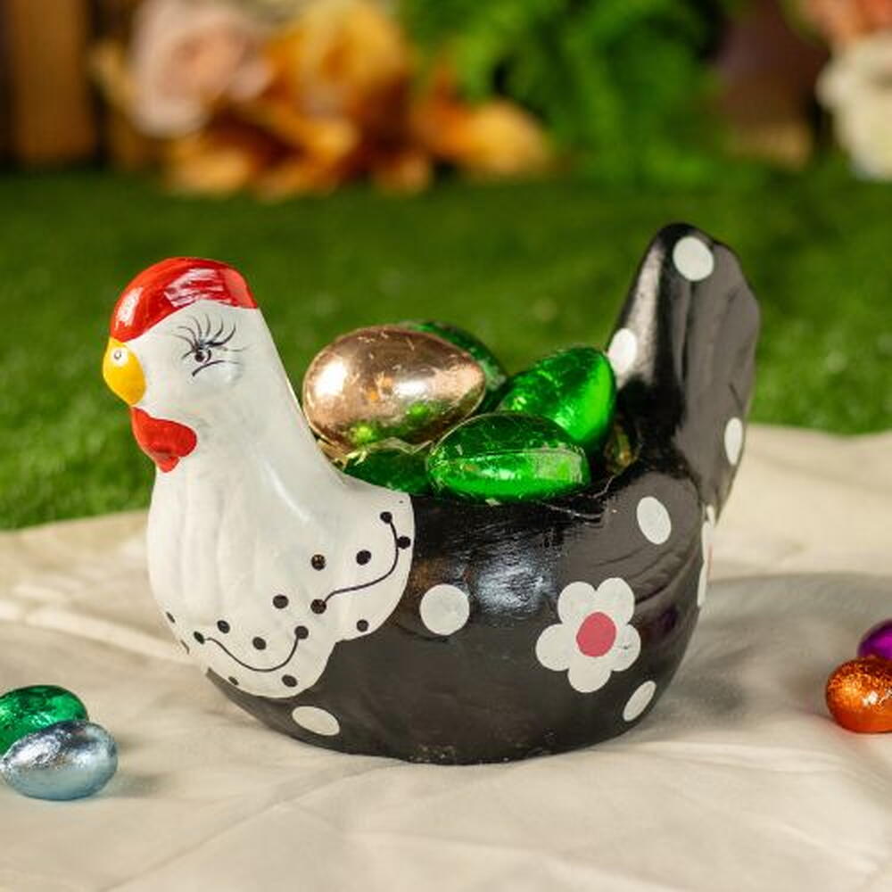 galinha decorativa em cerâmica - 1 un. ovos de galinha de chocolate ao leite - 1 un.