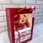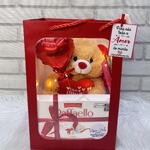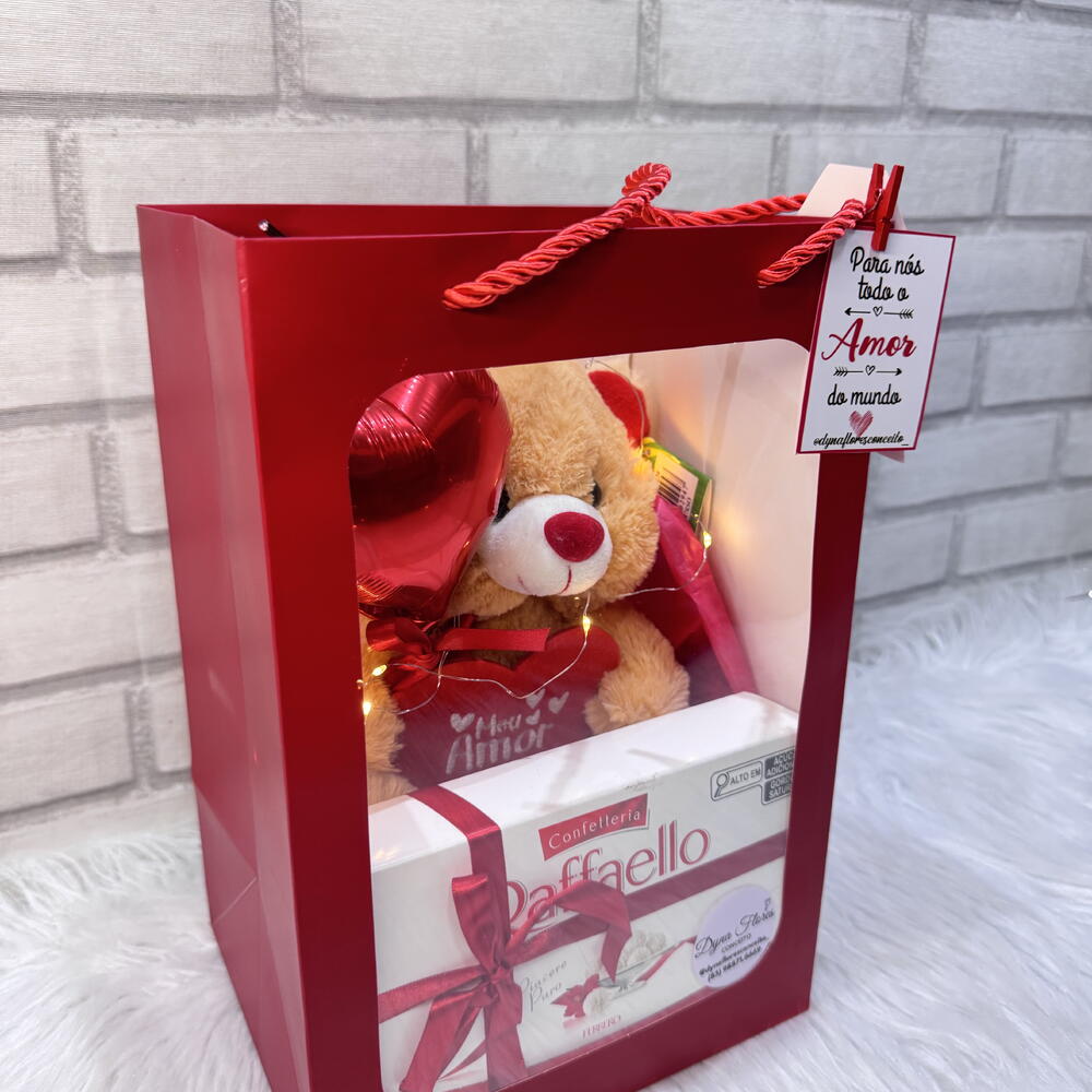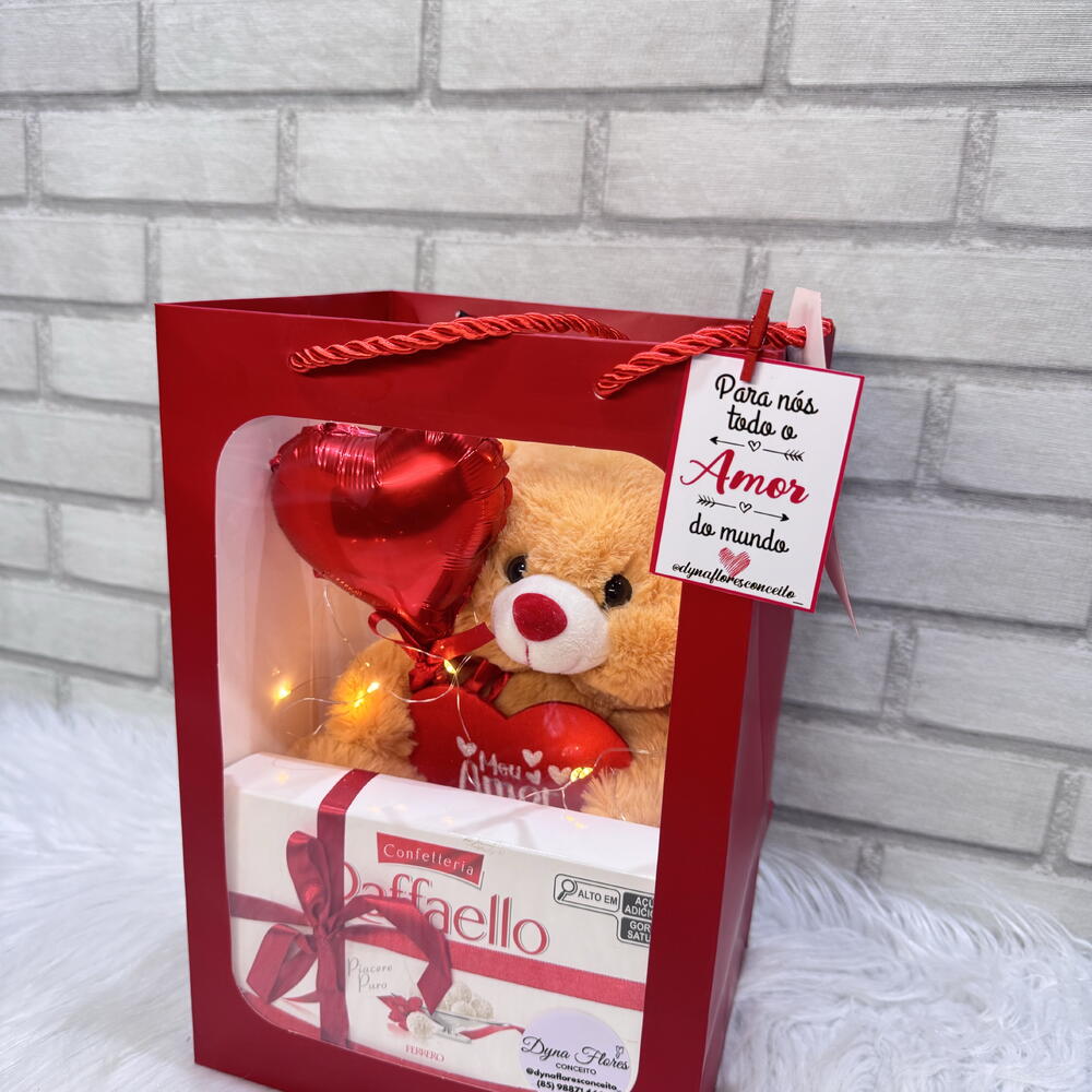 cartão mensagem - 1 un. raffaello - 1 un. tag - 1 un. sacola com visor - 1 un. balão coração 5 polegadas - 1 un. urso pelucia com fio de fada - 1 un.