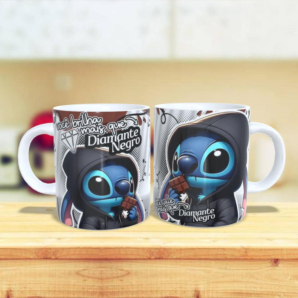 embalagem personalizada - 1 un. laço - 1 un. embalagem celofane - 1 un. caixa com 5 chocolates sortido (lacta e nestlé) - 1 un. caneca stitch - mais que diamante negro - 1 un.