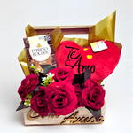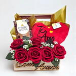 Esta cesta de chocolate requintada é o presente perfeito para expressar seu amor e carinho. Contém um charmoso coração de pelúcia que sussurra Te Amo, enfeitiçando seu amado com suas palavras doces e suaves. A cesta também abriga um tablete de chocolate Ferrero Rocher de 90g, cujo sabor rico e decadente pode derreter corações. Acrescente um toque de romance com um arranjo de flores naturais. Tudo isso é elegantemente apresentado em um baú de madeira genuína, adicionando um toque rústico ao presente. Este produto exemplifica perfeitamente a ideia de que o amor vem em muitas formas - e gostos.