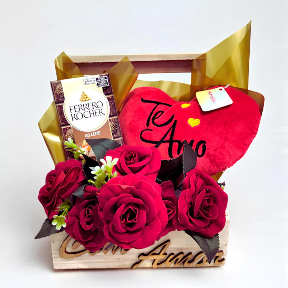 embalagem - 1 un. baú de madeira - 1 un. arranjo de flores naturais - 1 un. coração de pelúcia te amo; - 1 un. tablete de chocolate ferrero rocher 90g - 1 un.