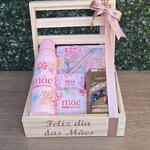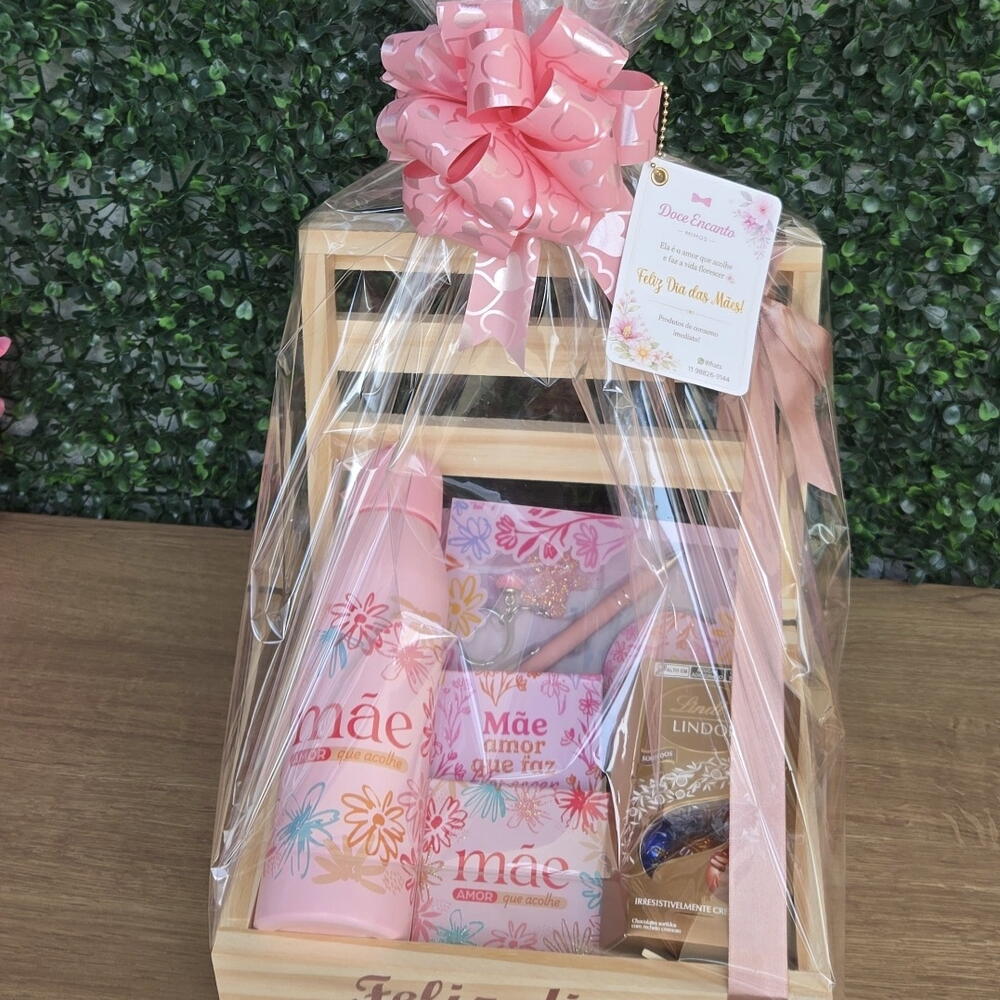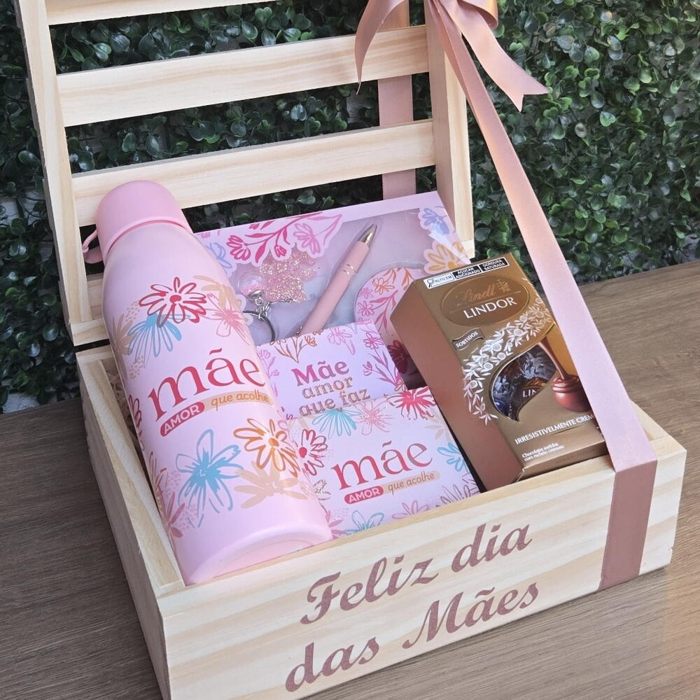tag de dia das mães - 1 un. caixa baú pinus 25x20 personalizado de dia das mães - 1 un. garrafa 600 ml de alumínio temática dia das mães - 1 un. bloquinhos de anotações - 2 un. caixa de bombons lindt misto 75 gr - 1 un. kit com chaveiro perolado - 1 un. mini espelho e caneta - 1 un. mini chaveiro de coração dourado escrito com amor - 1 un.