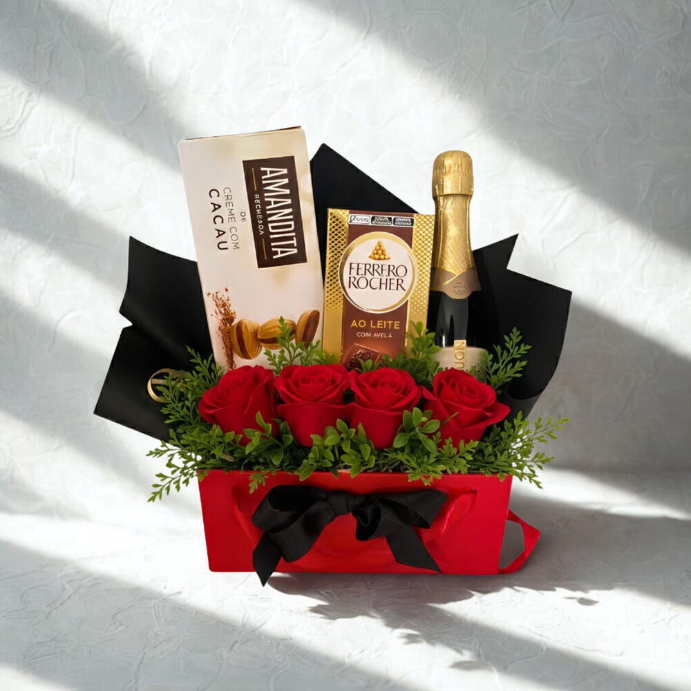 chandon 187ml - 1 un. chocolate amandita 200g - 1 un. tablete ferrero rocher 90g - 1 un. arranjo de rosa vermelhas naturais - 1 un. caixa de cartonagem vermelha - 1 un.