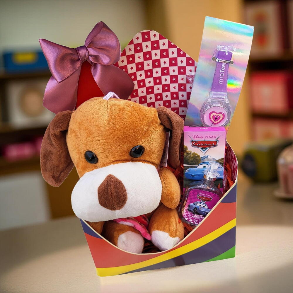 ✨🎁 Surpresa perfeita para o Dia das Crianças! 🎈 Esta linda cesta de presente é cheia de magia e diversão! Com um adorável cachorro de pelúcia, produtos incríveis do filme Carros e muito mais, é o presente que vai deixar a criançada radiante! 🐶💖 Não perca a chance de fazer esse dia ainda mais especial! 🌟 👉 Encomende já a sua e garanta sorrisos! 1 pelúcia antialérgico 1 mini atura jequiti 1 Relógio gloss 1 balão em formato de pirulito 🍭 1 laço Todos os nossos presentes vão com saco de celofane e uma sacola presenteavel