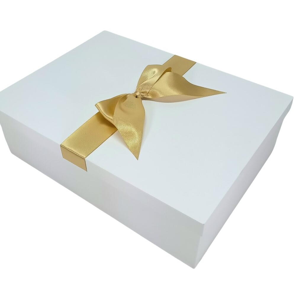 caixa decorada com laço de fita de cetim - 1 un. salton prosecco 750ml - 1 un. flores de chocolate - 8 un.