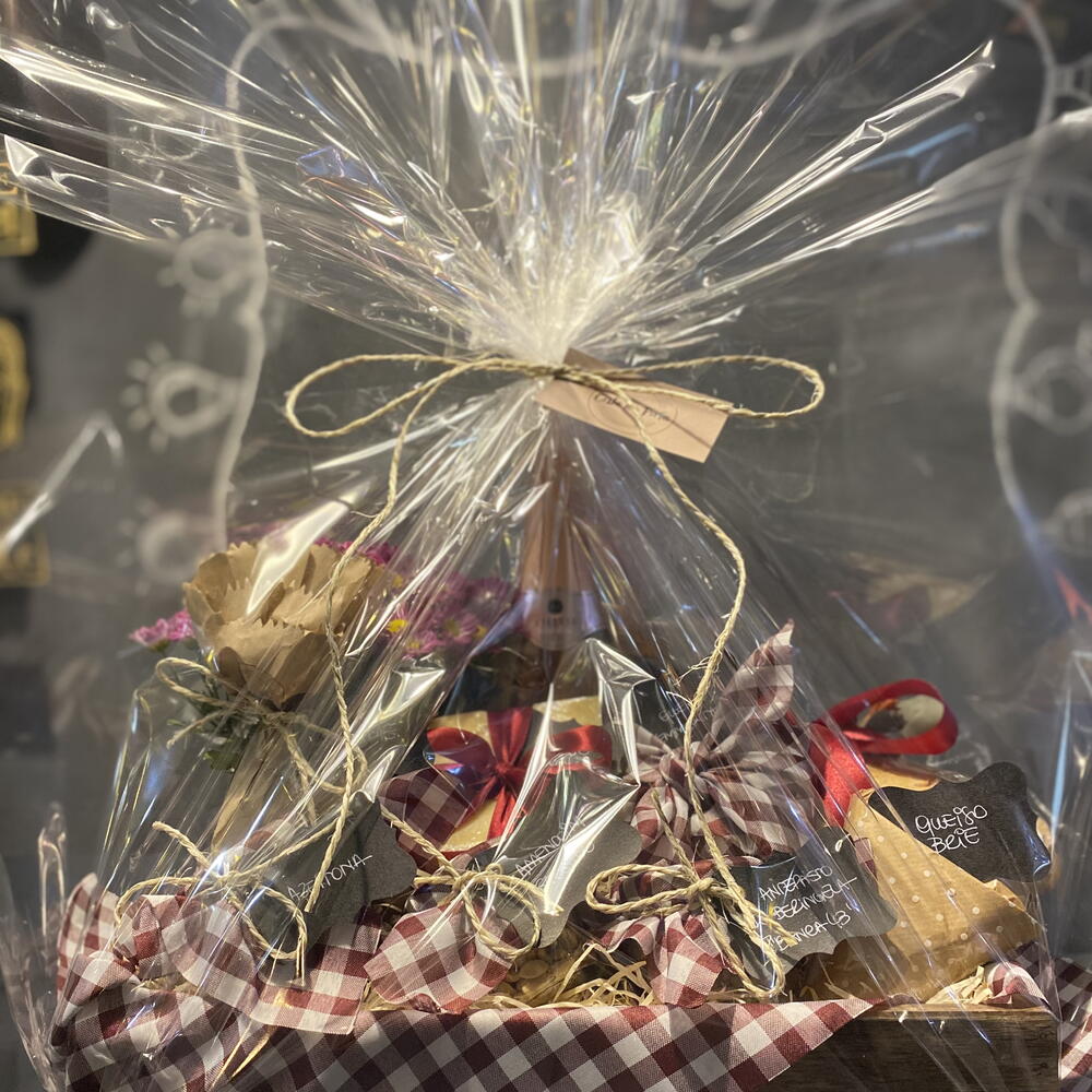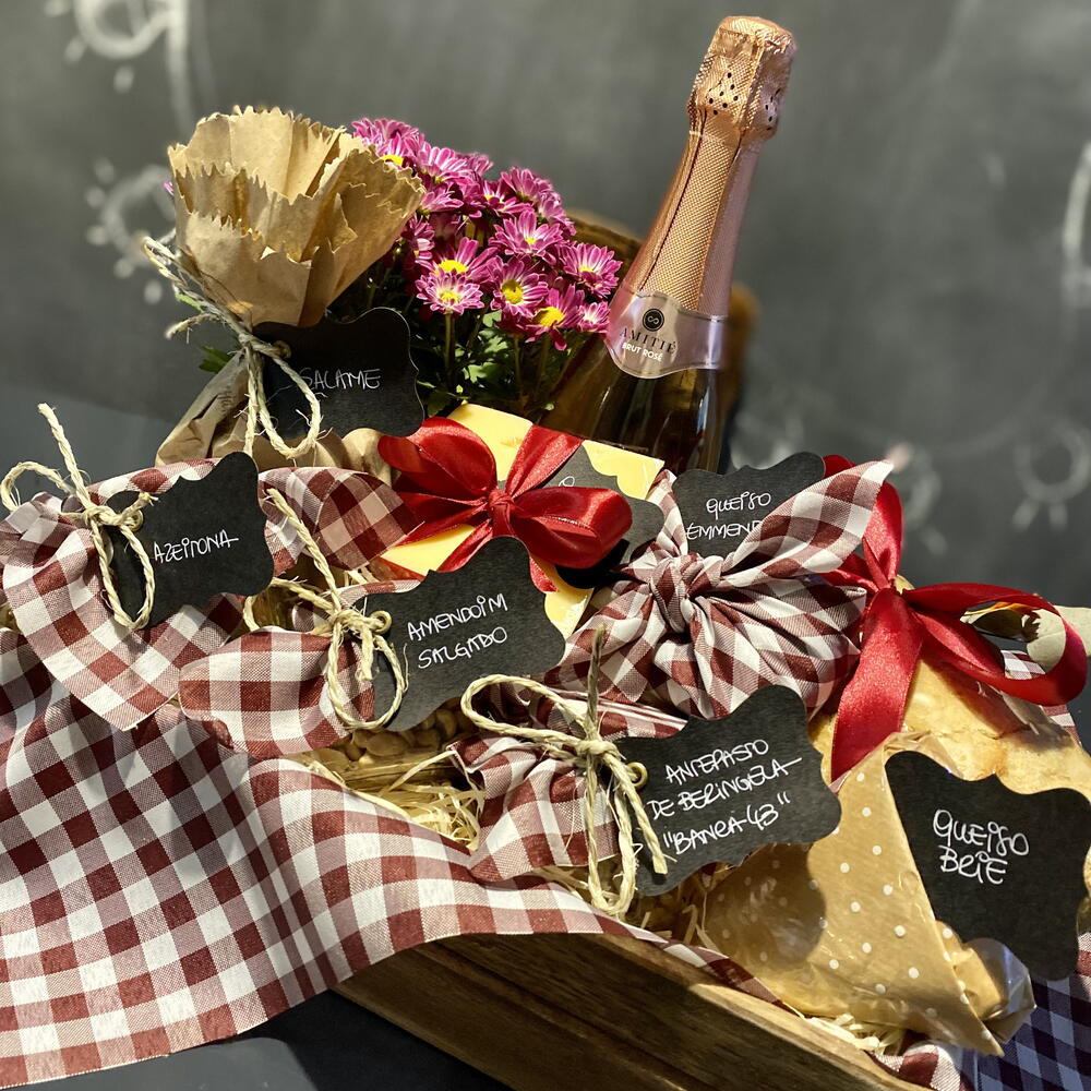 box - 1 un. salame - 1 un. amendoim salgado - 1 un. caponata - 1 un. queijo brie - 1 un. queijo gouda - 1 un. azeitonas - 1 un. pão rústico - 1 un. flor plantada - 1 un. tags - 1 un. tecido decorativo - 1 un. queijos e espumante na bandeja - 1 un. espumante seival miolo - 1 un. queijo emmenthal - 1 un.