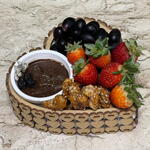 Cesta em formato de coração composta por fondue de chocolate, morangos frescos, uvas e castanhas caramelizadas. Criada para proporcionar um momento doce, intimo e inesquecível.