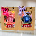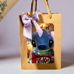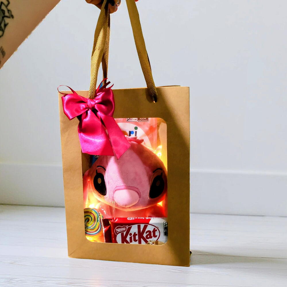 chocolate kit kat - 1 un. pirulito colorido - 1 un. balas fini - 2 un. pelúcia stitch 25 cm ou angel - 1 un. sacola presenteavel com visor - 1 un.