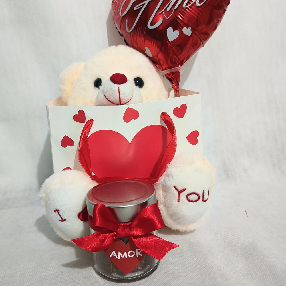 cartão de mensagem - 1 un. polaroide - 1 un. balão metalizado em forma de coração - 1 un. urso 23cm na sacola temática - 1 un. pote bombons lacta ou nestlé - 1 un.