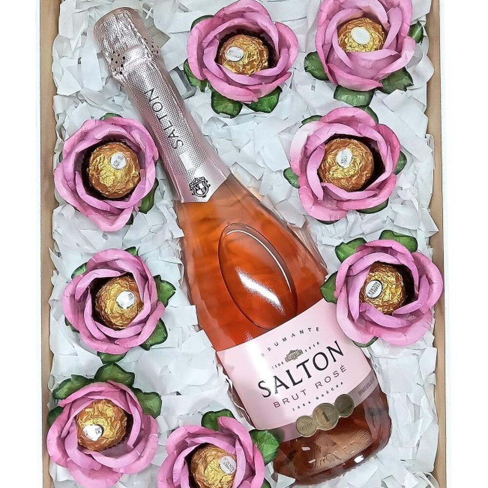 caixa decorada com laço de fita de cetim - 1 un. flores de bombons ferrero rocher - 8 un. salton brut rose 750ml - 1 un.