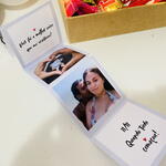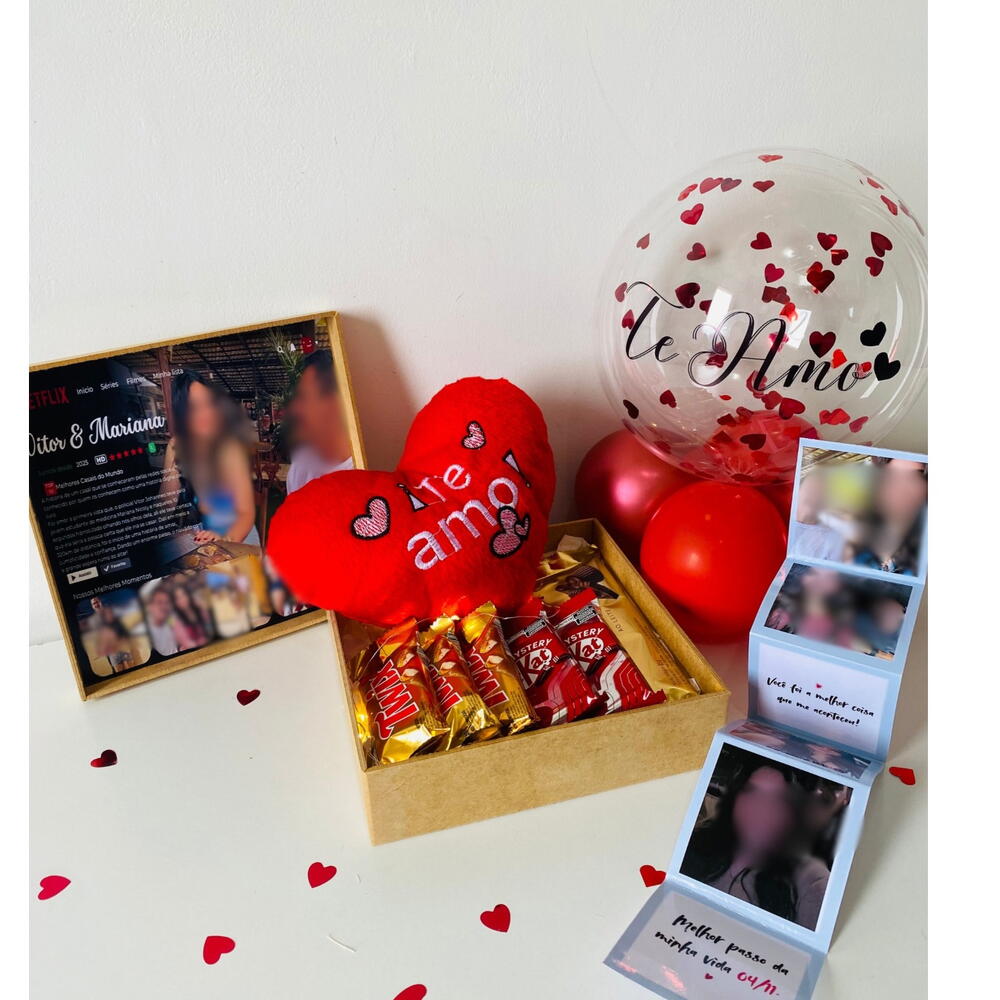 barra de chocolate - 1 un. kit kat - 2 un. chocolates - 3 un. cartão mensagem - 1 un. caixa mdf - 1 un. fio de fada (led) - 1 un. personalização na tampa lado de dentro - 1 un. sinopse do casal com 5 fotos - 1 un. tira dobrável com 6 espaços - 1 un. almofada coração com frase ou time - 1 un. arranjo de balão bubble - 1 un.