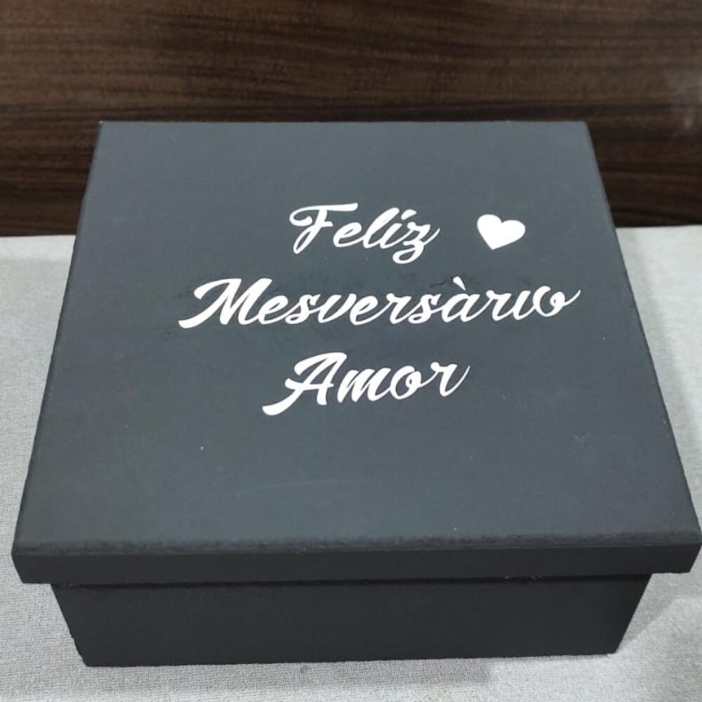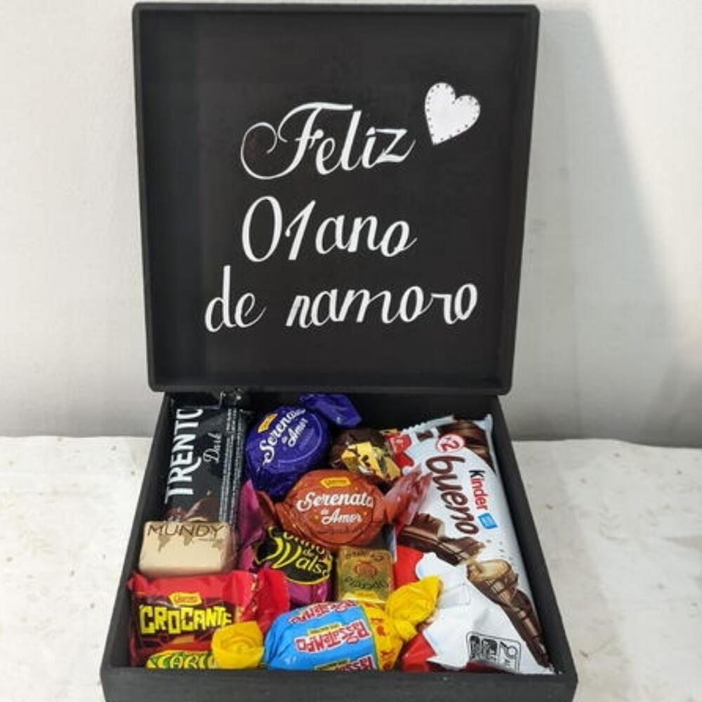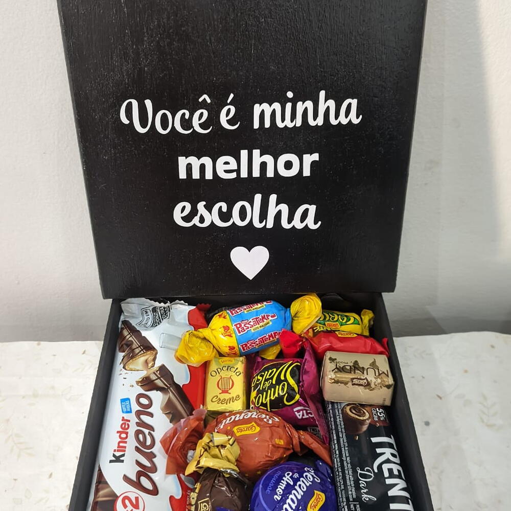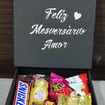 kinder bueno - 1 un. bombons diversos - 1 un. laço em cetim - 1 un. barrinha trento especiale - 1 un. barrinha stars ou similar - 1 un. fotos mini polaroid - 2 un. caixa preta personalizada p até 3 palavras - 1 un.